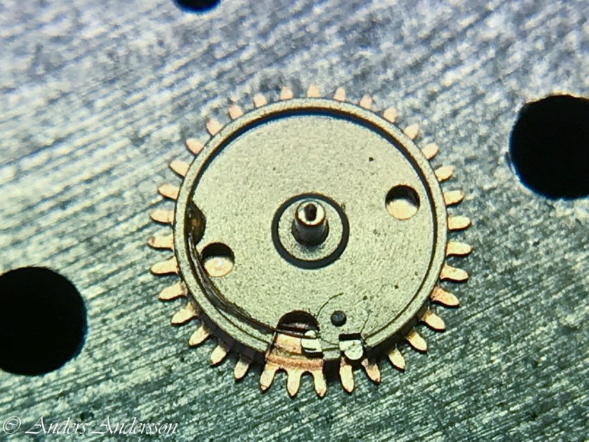 20180226-iPhone-0046 Publicerat 25 mars, 2018 kl. 1200 × 900 i Longines 341 – lite om ett klinkhjul Här syns fjädringen för spärrklinkan, den satt löst. Limmade fast den med snabblim.