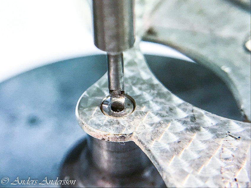 20180305-iPhone-0125 Publicerat 1 maj, 2018 kl. 1200 × 900 i Movadofickur med lagerproblem Det gick fint att riva upp hålet i steninpressaren. Var noga med att ”dra” hålet rätt så att inte hjulet lutar – visarna tar i glaset.