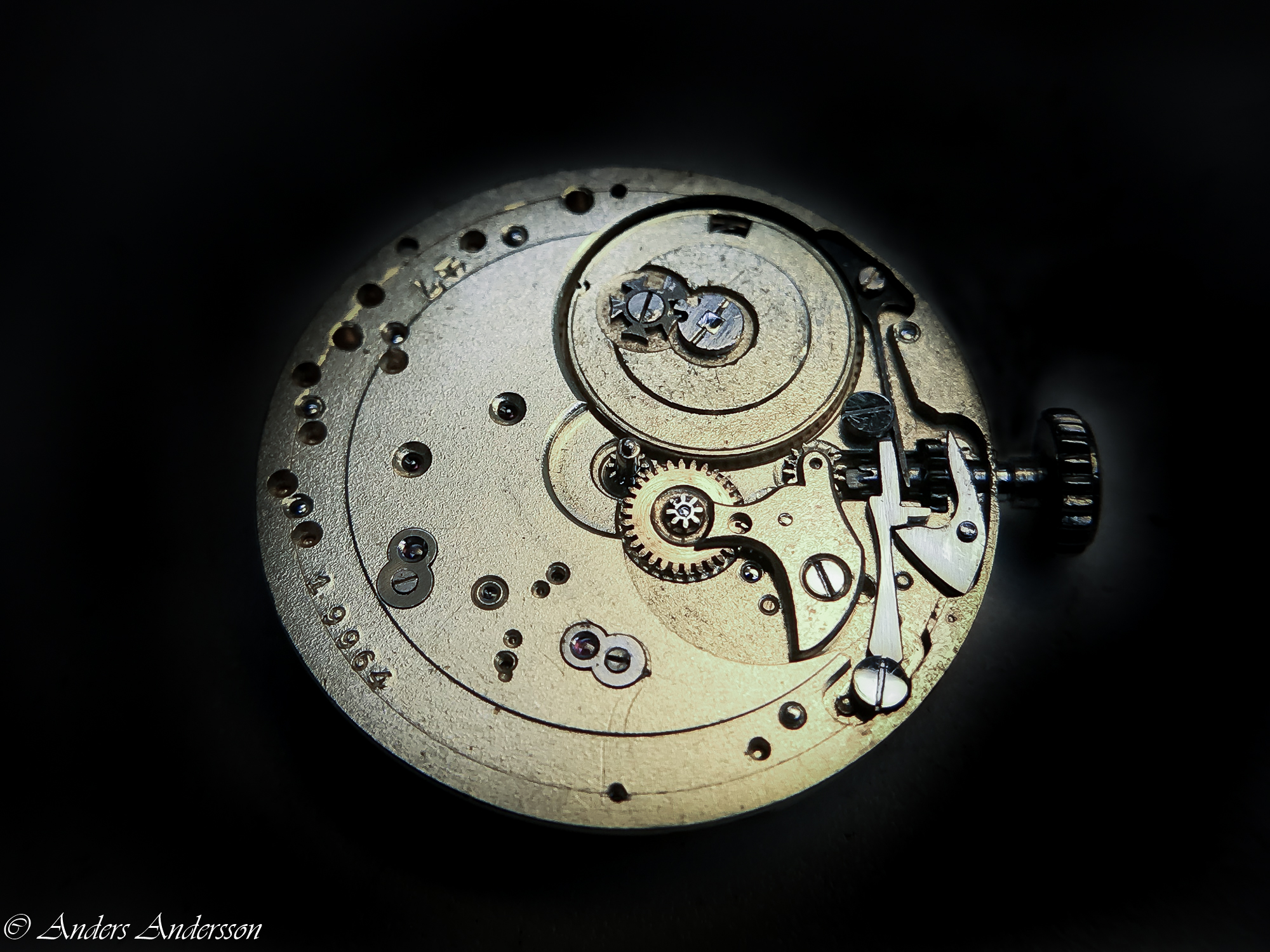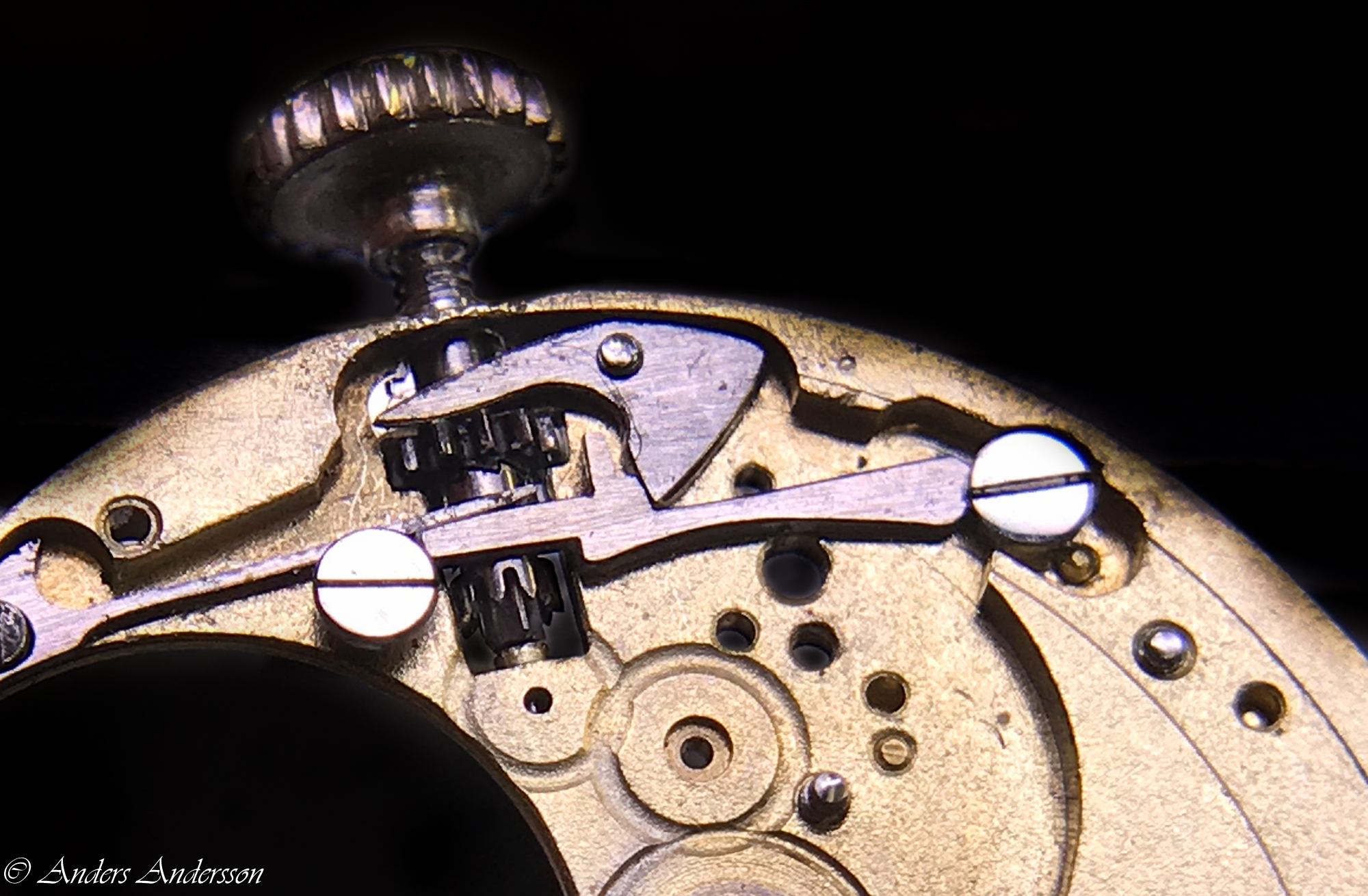 Det är ju inte direkt något vardagsarbete, man ser visarställarmar, man vet hur det ska fungera – när kronan dras ut skall muffhjulet skjutas fram mot visarställhjulet så att det går att ställa klockan, när kronan är intryckt ska armen kunna röra sig när kronan dras bakåt och ligga still när klockan dras. I detta verk ligger dessutom fjädringen i samma spår i muffhjulet – armen måste kunna röra sig fritt gentemot fjädern – i sina lägen.