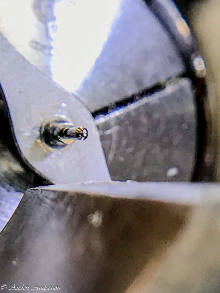 Med hjälp av en noggrant slipad och polerad stickel gör jag en försänkning exakt i mitten av axeln, kontrollerar noga så att jag verkligen hamnat i mitten och att försänkningen inte har någon utskickande topp i centrum, vilket lätt blir resultatet om inte stickelns spets är perfekt.