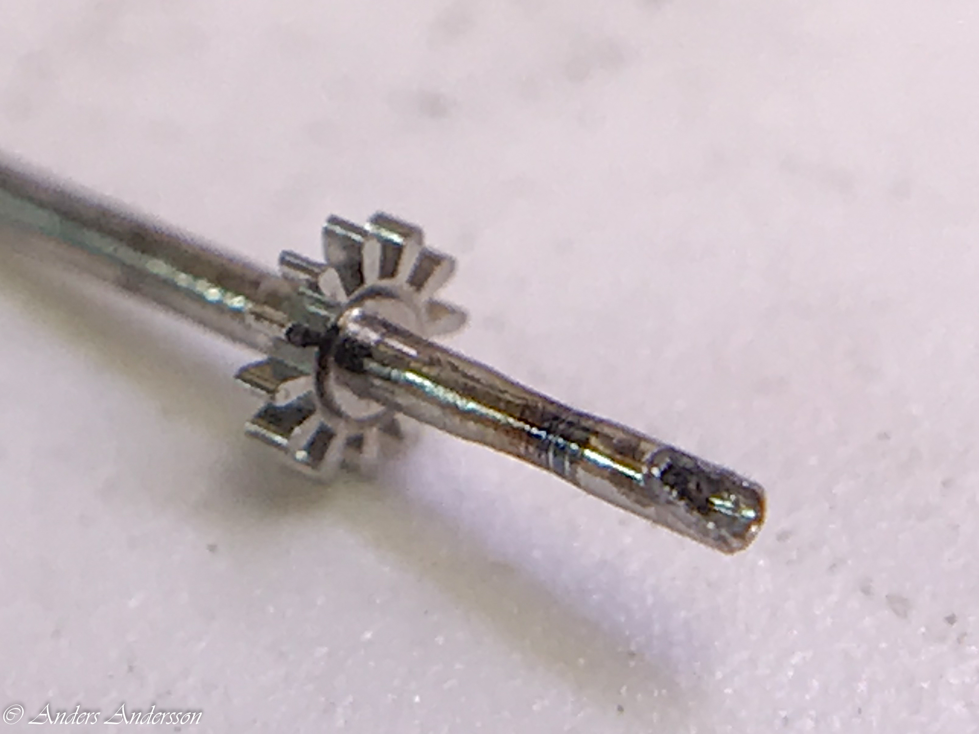 20210107-iPhone-0149 Publicerat 17 januari, 2021 kl. 2000 × 1500 i 20210107-iPhone-0149 Hålet hade spruckit, antagligen när visaren tryckts fast. Man har försökt att tennlöda fast den inborrade tappen. Det fungerande inte så bra. När hålet sprack ”svällde” axeln något och nollställningen gick trögt.