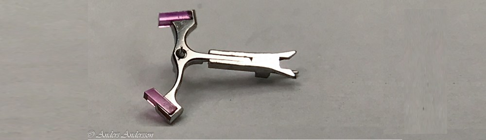 I denna typ av fina ur är hakstenarna inslipade av en gångriktare. När jag satte tillbaka stenarna räckte det med att trycka in dem i botten och sedan fixera dem – gången är redan inställd. Detta i motsats till moderna ur där urmakaren måste flytta hakstenarna för att ställa in gången rätt. Nästa moment blir att justera in anslagen. Här fick jag fila av sidorna på min tillverkade del tills gången gick igenom – enkelt uttryckt tills gånghjul och hake tickade fram. Denna klocka har inga anslagsstift utan anslagen är en del av verkbottnen. När jag justerat anslaget så att gånghjulstanden faller in på vila 1, sedan kontrollerat så att det fanns även dragning till vila 2 – då var det dags att börja forma hornen på haken. Då filade jag hornets yta tills liverstenen kunde passera fritt med luft och säkerhet. När jag i detta skede drog upp verket för att ge kraft fram till gånghjulet och satte fart på balansen gav haken tillräcklig kraft för att balansen skulle röra på sig utan spiral. Nu justerade jag längden på säkerhetskniven. Då vrider man balansen så att liverstenen går fritt ifrån haken. Då ska kniven ta i den lilla rullen på liverrullen, det skall vara lagom luft mellan lilla rullen/kniven/anslaget. Du kan se bilder och hur jag ställer in gången i ett annat inlägg genom att klicka här.