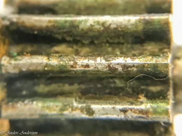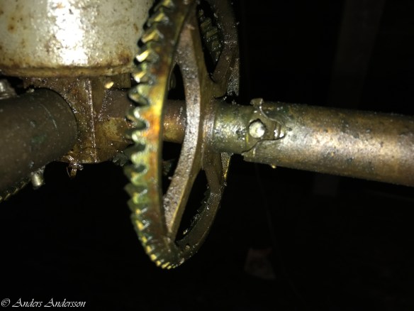 Gånghjulsdriven var full med gammal olja. Man kan ana ett slitage på drivtänderna under smutsen.