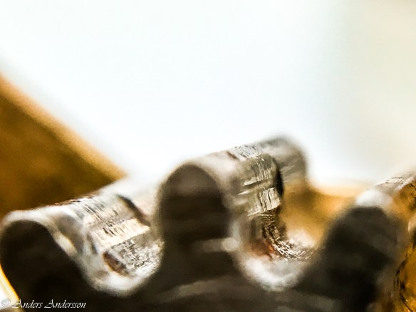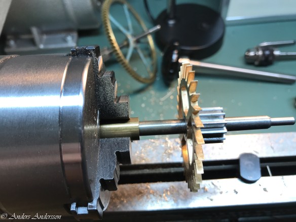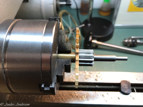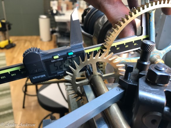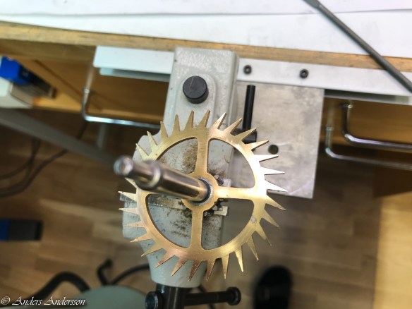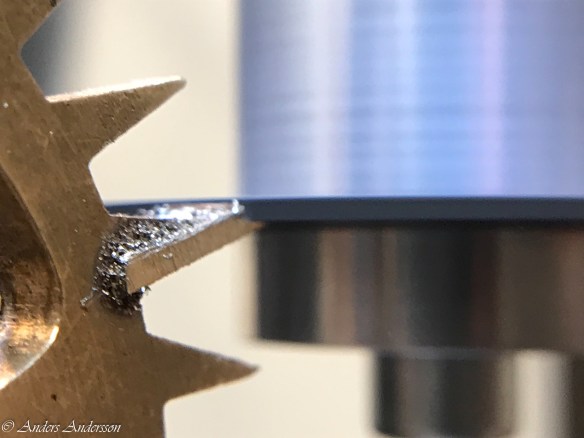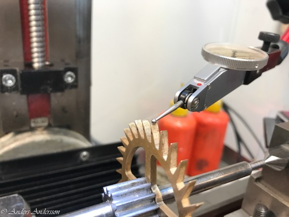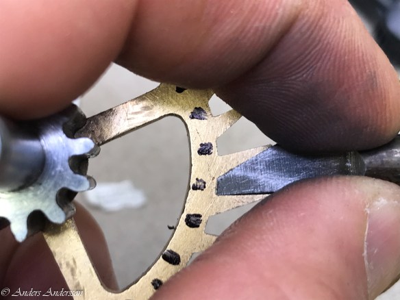 När alla tänder riktats provade jag gånghjul och hake i verket. Skulle de skadade tänderna fungera?