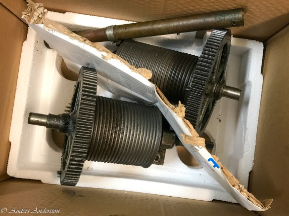 Valshjulen fanns kvar i tornet. Vi gjorde en resa till Alafors för att hämta dem och samtidigt inspektera urtavlor, visarväxlar, loden etc.