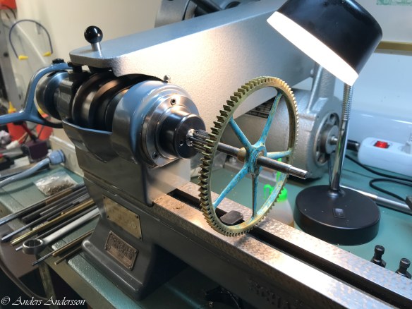 Mellanhjulet uppsatt i svarven för polering.