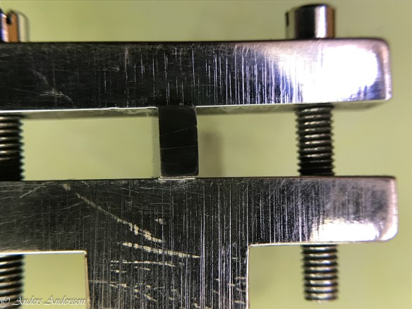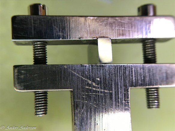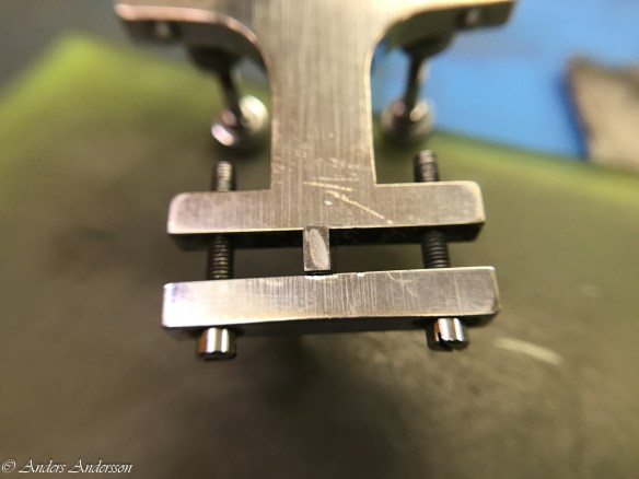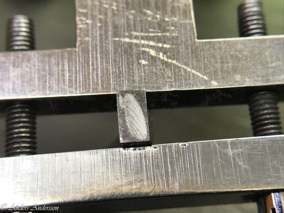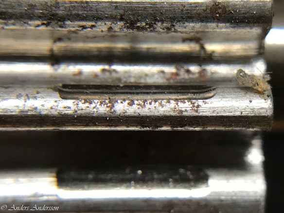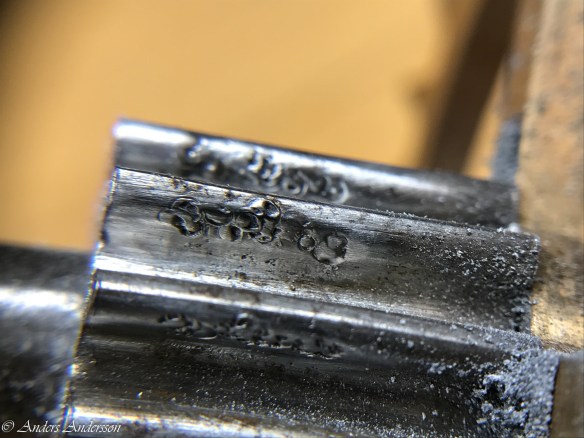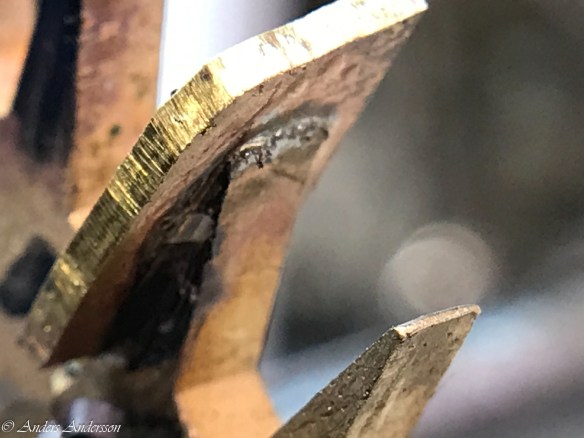 Det visade sig att mitt uppmätta centrumavstånd och det som fanns i klockan överensstämde, så någon justering behövdes inte. Man får väl betänka att klockan fungerat sedan 1906 med allt vad det innebär av smuts och partiklar i verket. Alla föroreningar bildar en smet av slipmedel som under årens lopp äter sig in i stålet. Får hoppas att den nya ytan vi gjort kommer att hålla i 100 år till!