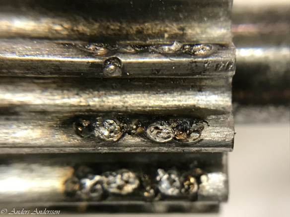 Flera ståldelar var slitna. Här jag vi tagit reda på stålets hårdhet. Var materialet härdat eller inte? Hur hårt? Det visade sig vara stor skillnad mellan de olika delarna.
