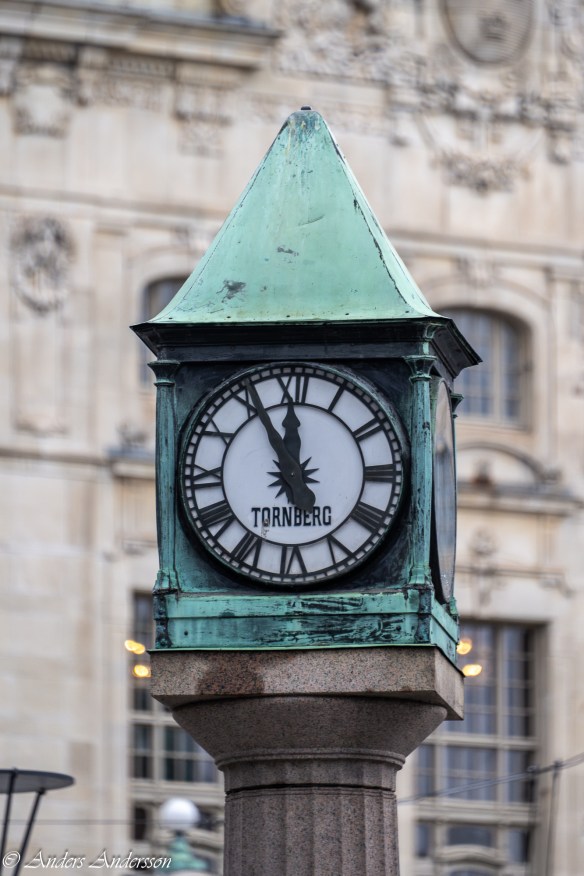 Tornbergs klocka vid Nybroplan. Dramaten i bakgrunden.