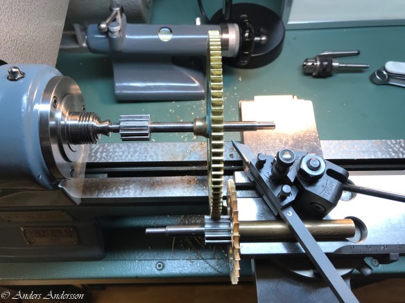 Klämde fast röret i svarvens support och satte upp mellanhjulet med en spännhylsa i svarven. Med hjälp av veven på supporten kunde jag sedan justera centrumavståndet tills jag fick bästa möjliga ingrepp.