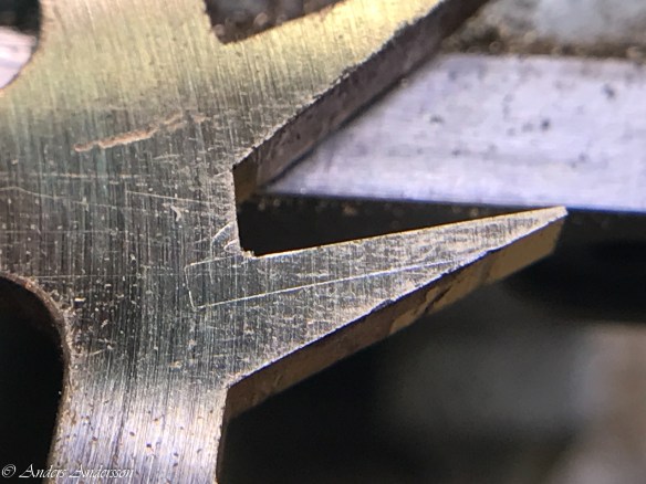 Flera gånghjulständer var skadade och böjda. För att kunna rikta upp dem på ett bra sätt tillverkade jag en passbit som passade mellan två tänder (oskadade). Först grovriktade jag med en fin flacktång, sedan använde jag passbiten som mall. När alla tänder var riktade satte jag upp en mätklocka och kontrollerade så att alla tänder var lika långa. Det visade sig att två tänder var såpass skadade och korta att jag blev tvungen att fälla in nytt material.