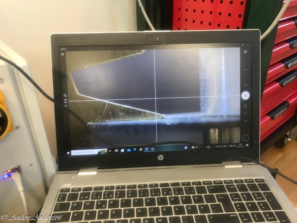 Sätter upp en slitsfräs i fräsmaskinen. Tar hjälp av en USB-kamera för att rikta in fräsen.