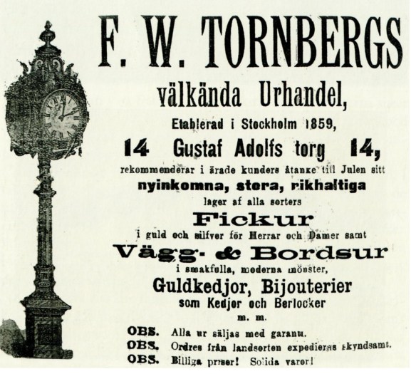 Reklam för F.W. Tornbergs Urhandel. Bild från Wikipedia