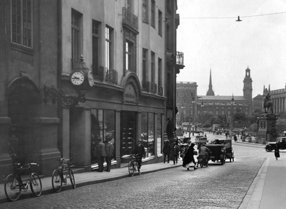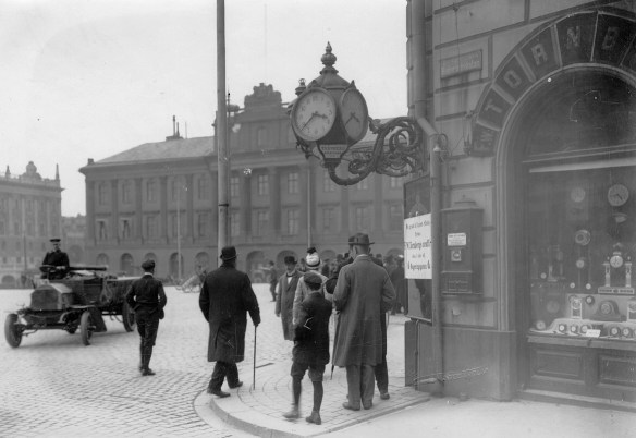 Tornbergs klocka vid Nybroplan 1917. Stockholms stadsarkiv.