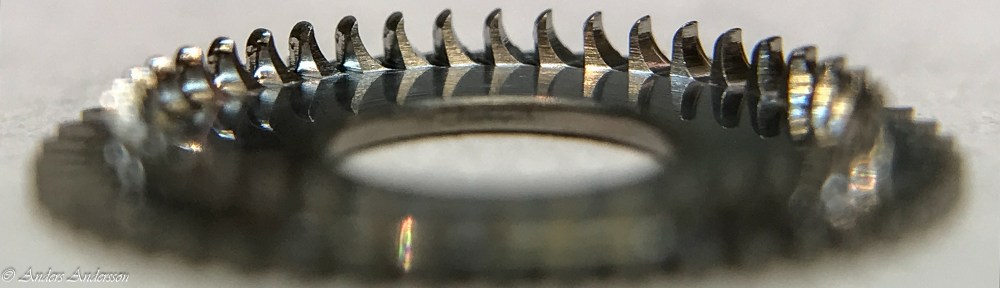Den komplicerade formen på fjäderhusaxeln och spärrhjulet.