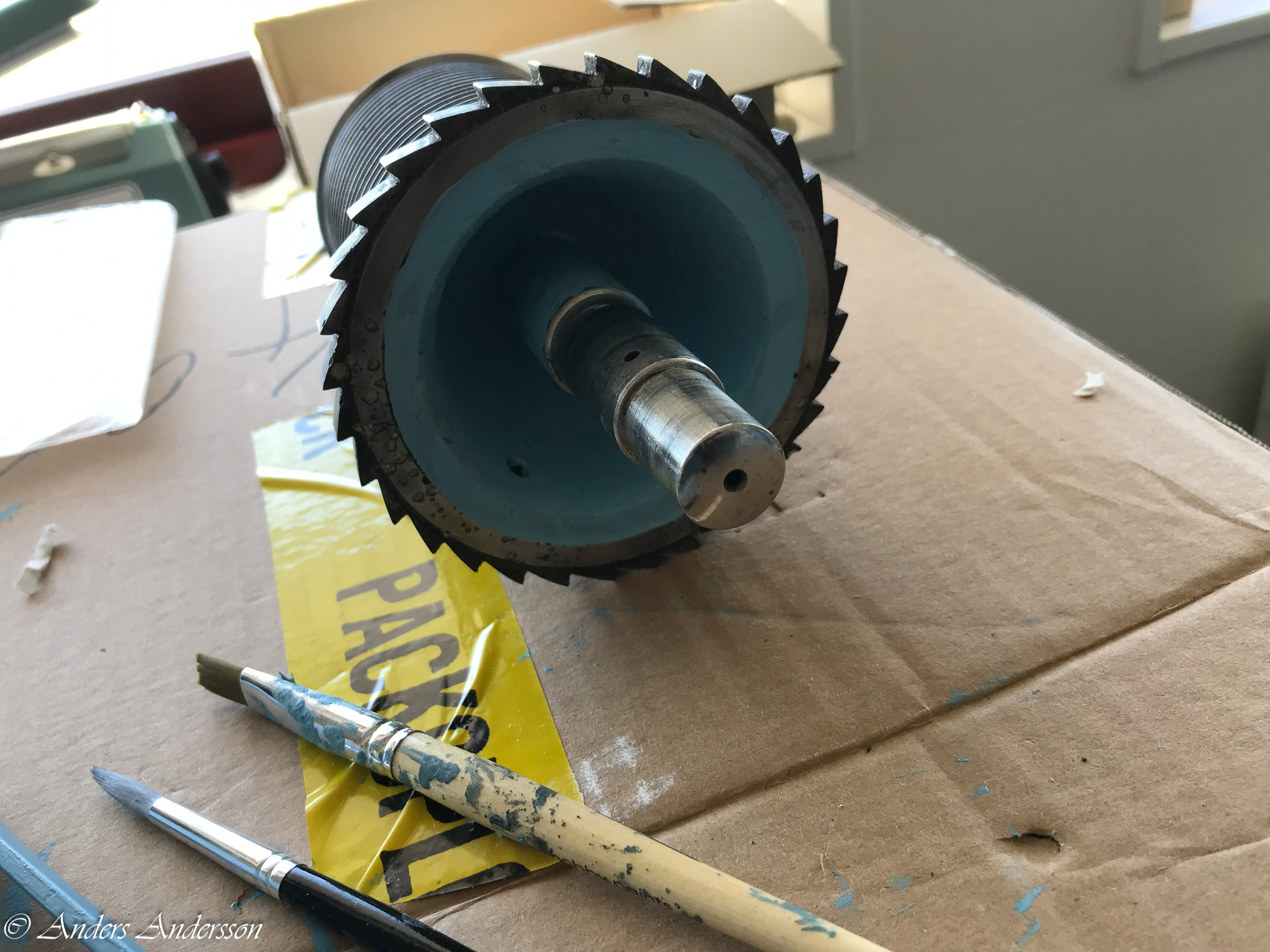 Notera även den slitna balanstappen. Trumpeten och tappen har fel form, ”hemmagjord” balansaxel.