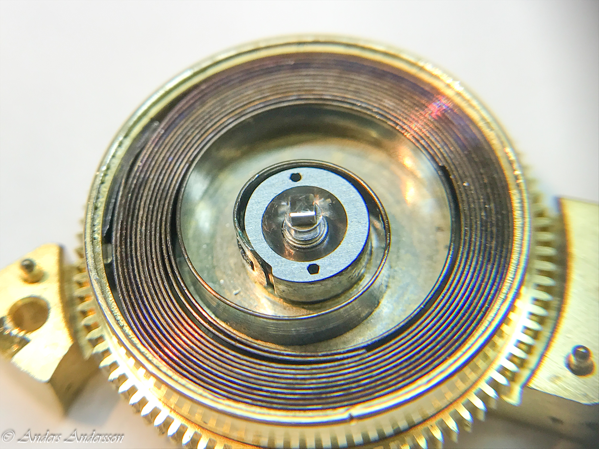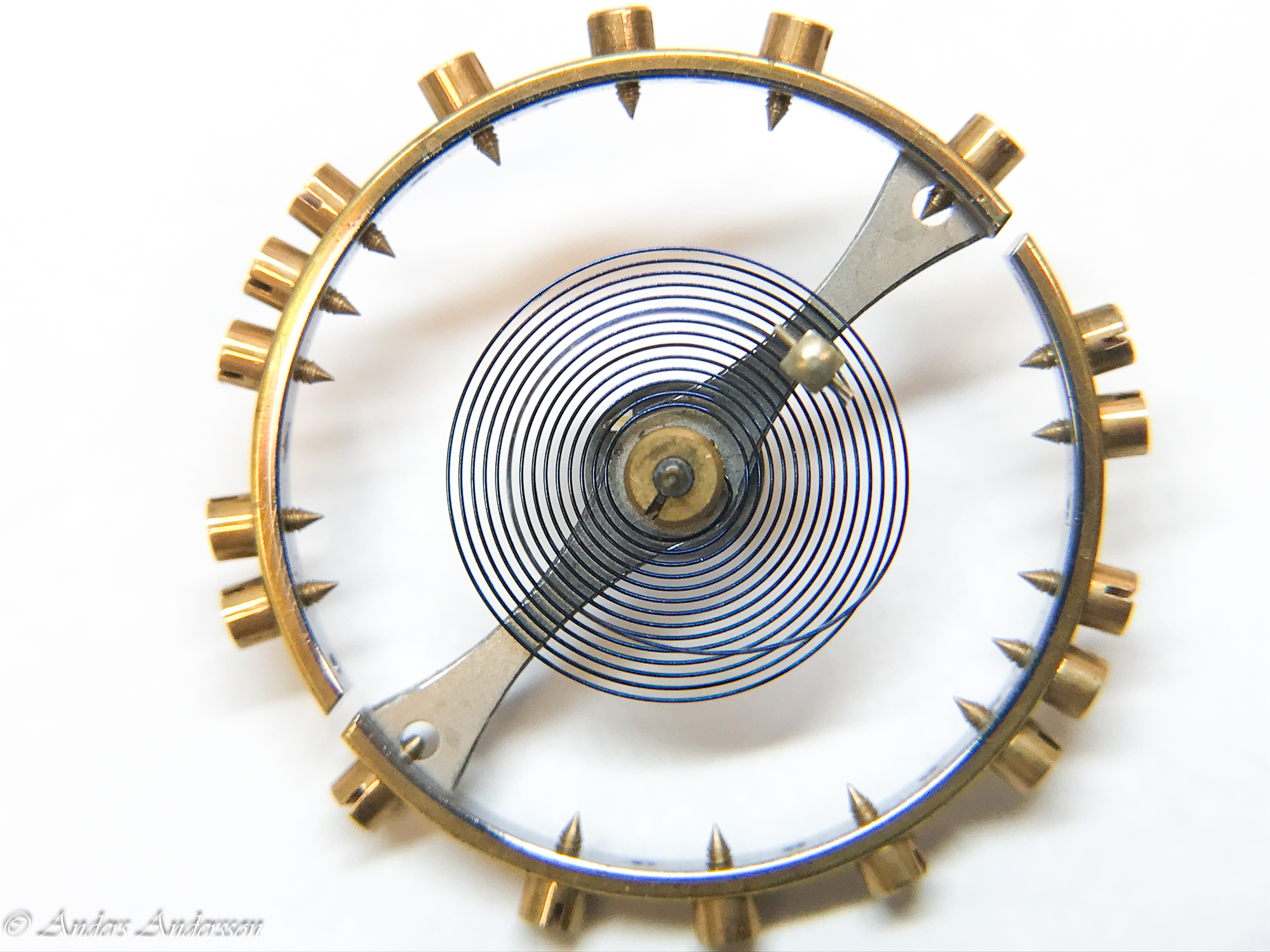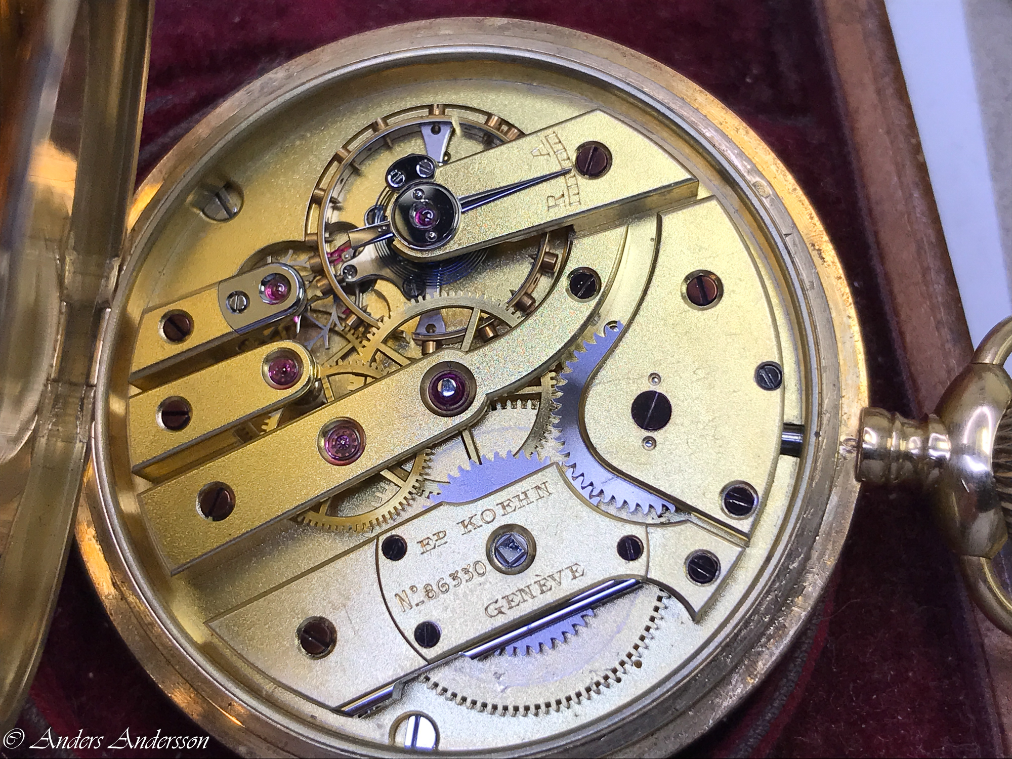 Balanskloven var nedåtböjd och förgyllningen var delvis bortslipad på ovansidan. När jag tog bort kloven syntes att någon filat ned framkanten så att kloven ytterligare skulle luta. Verket har kronometergång, kompensationsbalans med cylindrisk spiral. Balansaxeln såg ”hemmagjord” ut och var definitivt utbytt någon gång.