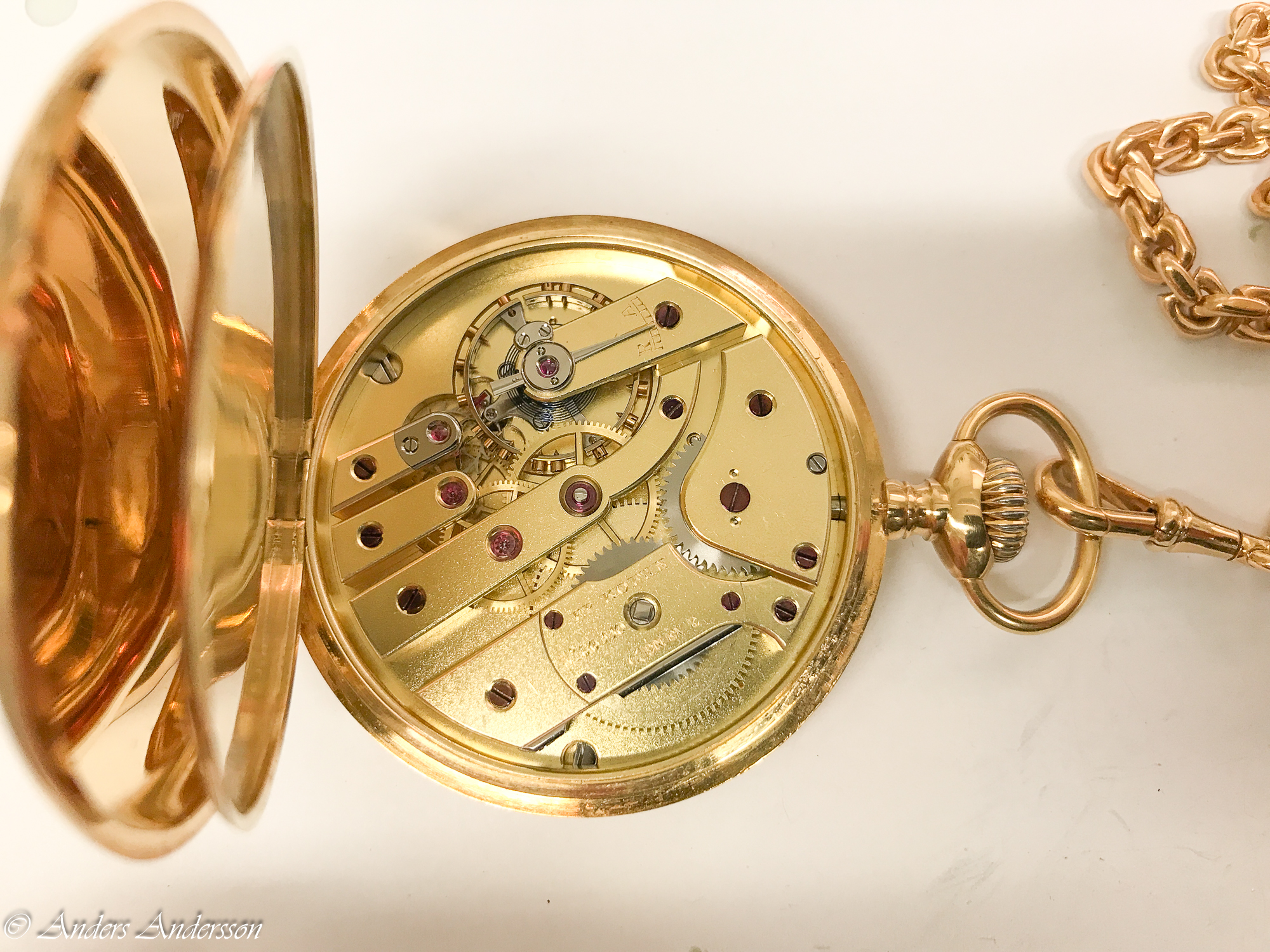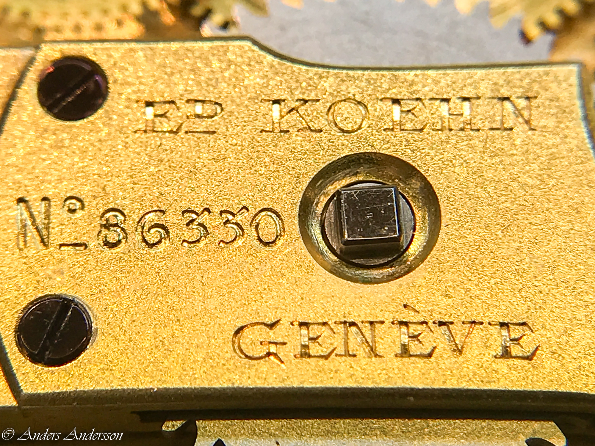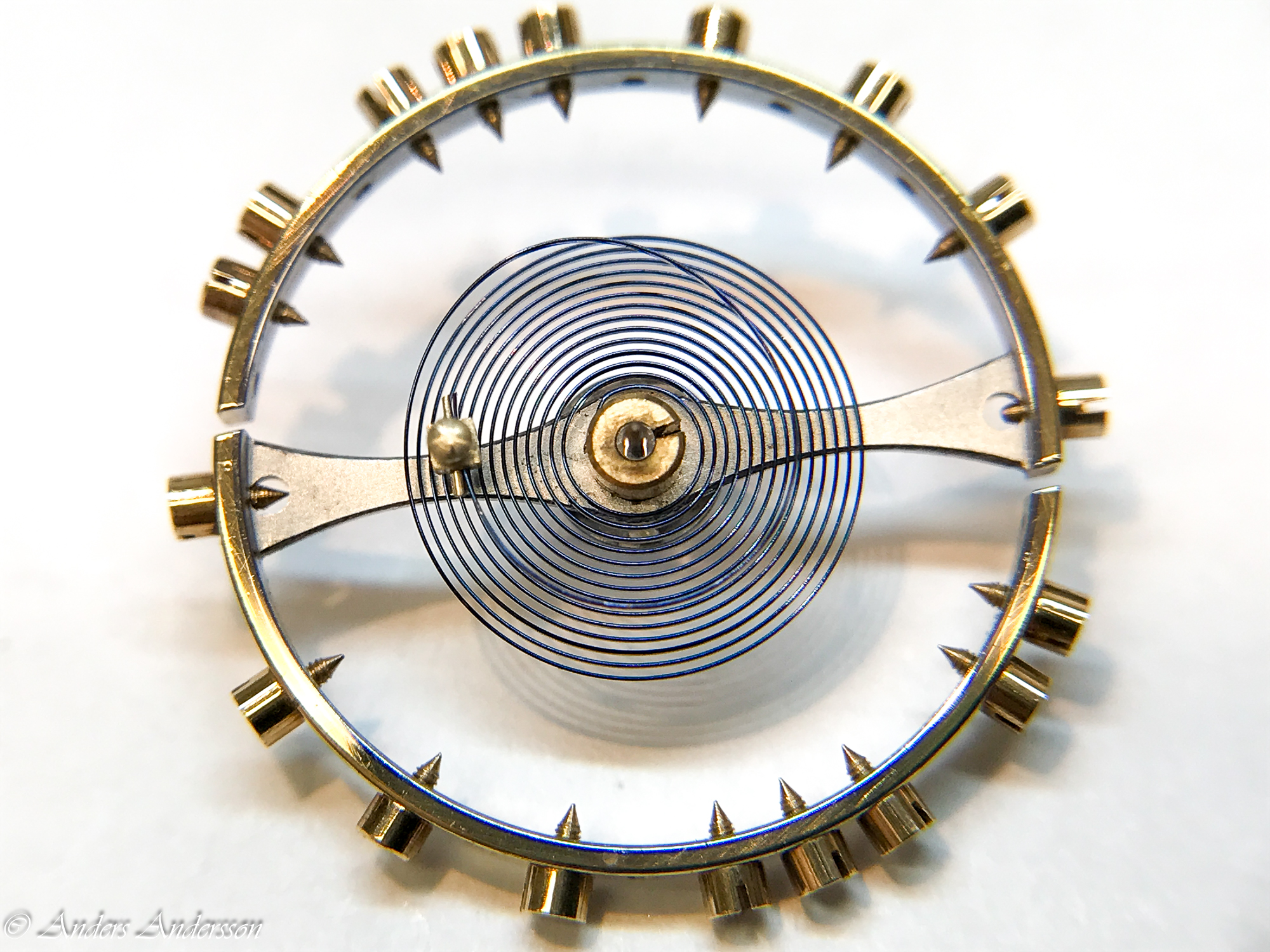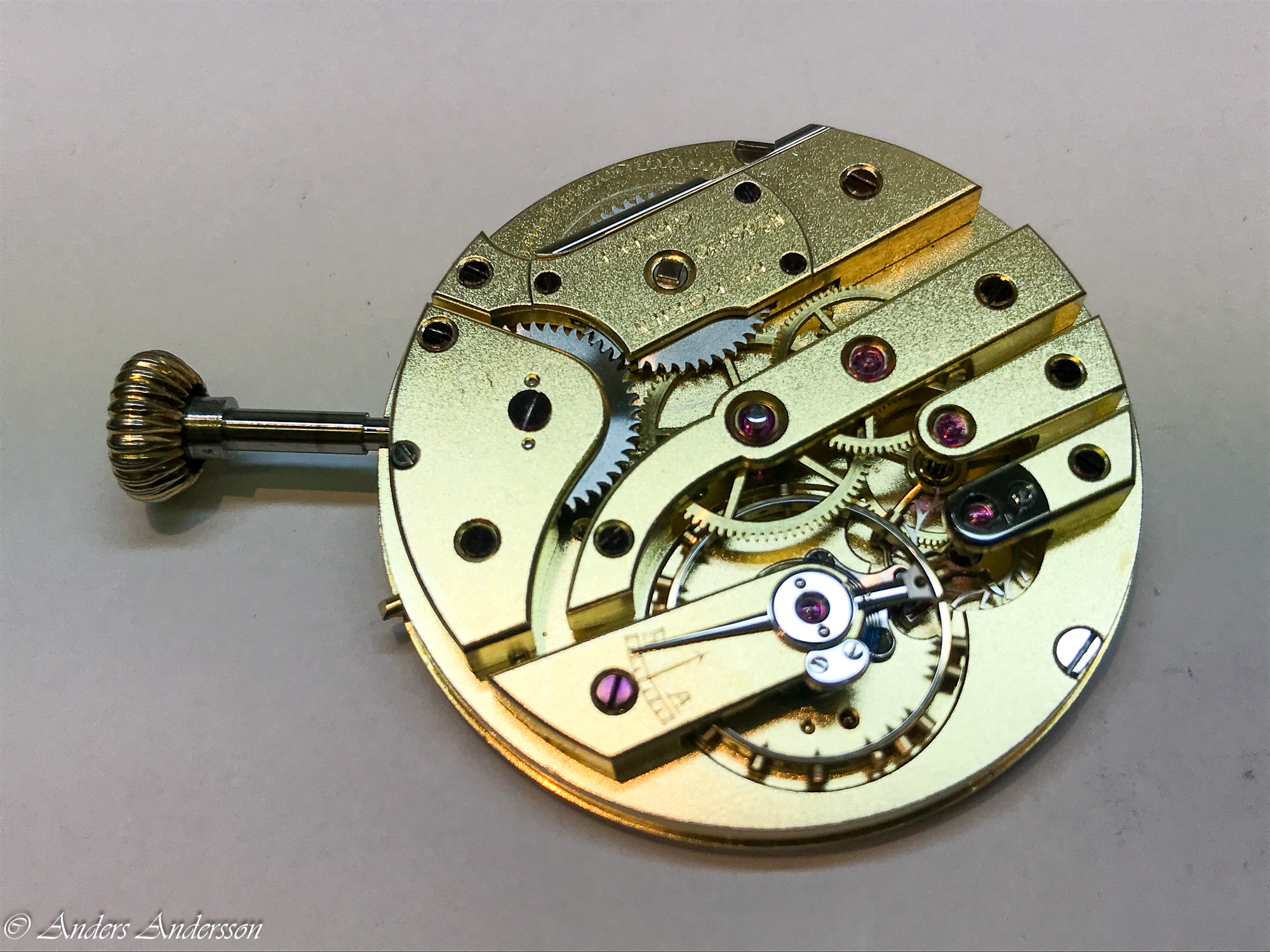 Balanskloven var nedåtböjd och förgyllningen var delvis bortslipad på ovansidan. När jag tog bort kloven syntes att någon filat ned framkanten så att kloven ytterligare skulle luta. Verket har kronometergång, kompensationsbalans med cylindrisk spiral. Balansaxeln såg ”hemmagjord” ut och var definitivt utbytt någon gång.