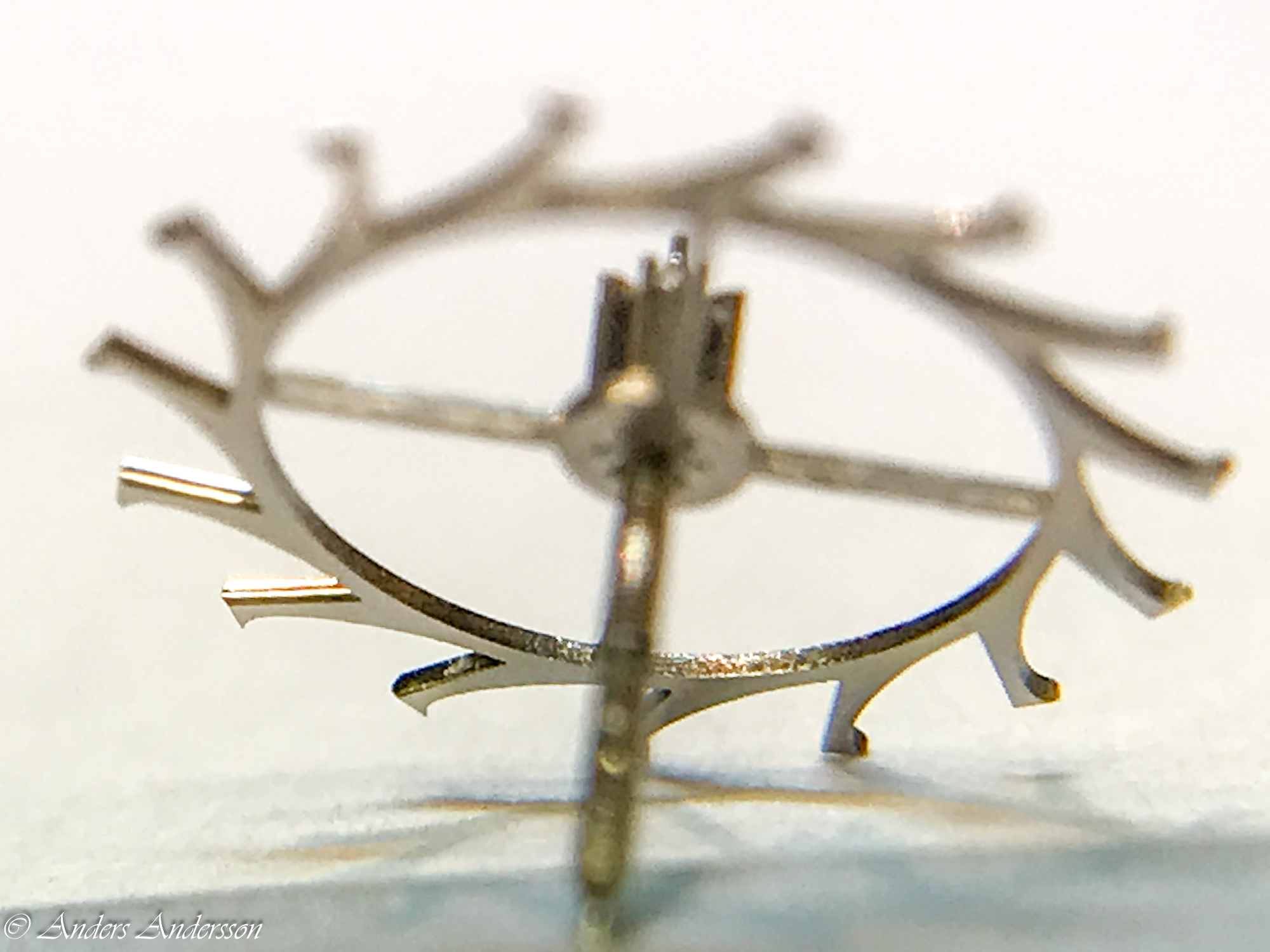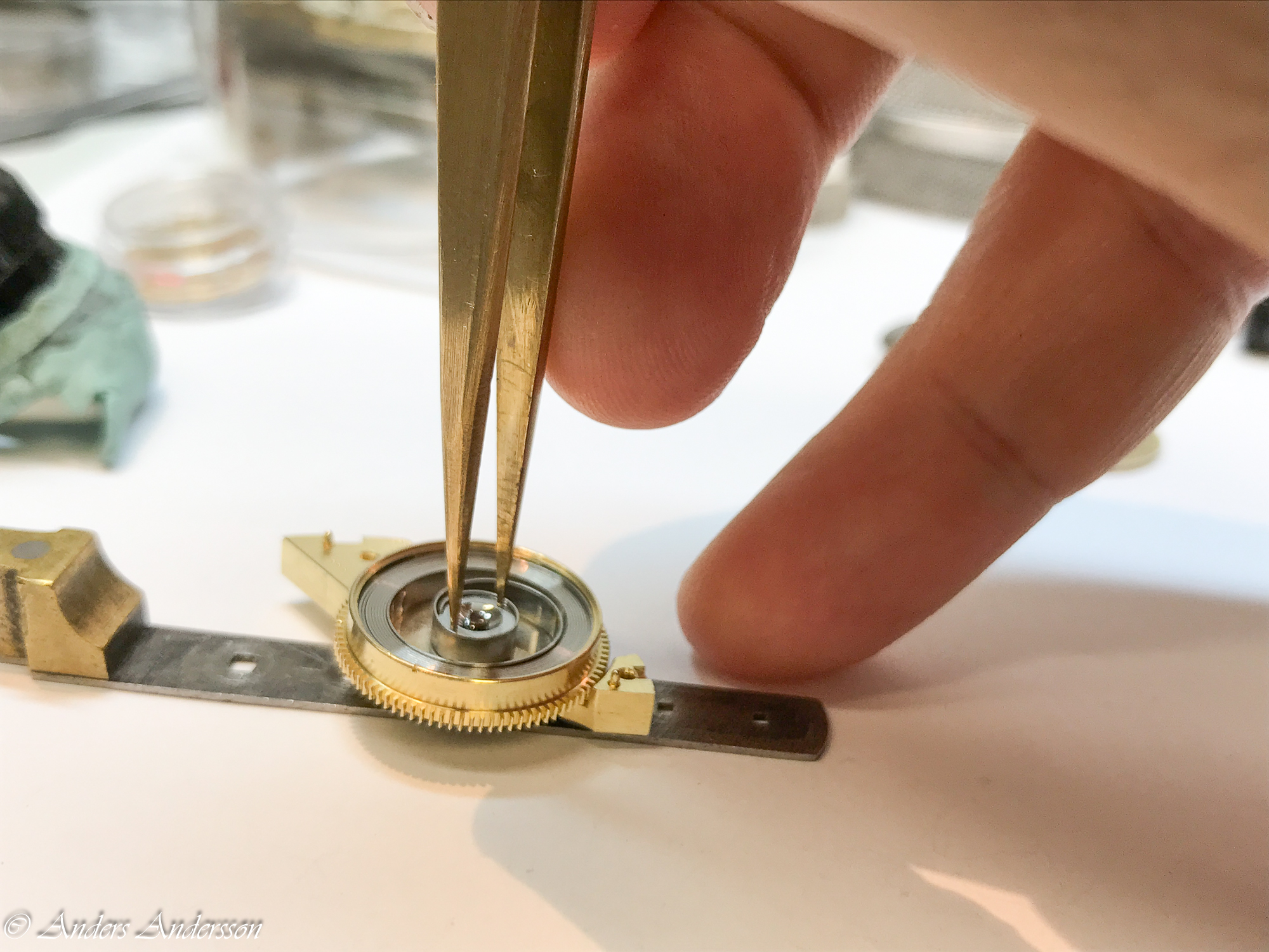 Provade att ta bort motstenen för balansen, det visade sig att det satt en lös chaton för balanshålet. När den lossade något ur sin fattning visade det sig att balansen faktiskt började röra på sig och den började ticka. Fick en idé att svarva en ny chaton där hålet satt ocentrerat så att balansen skulle bli planare.