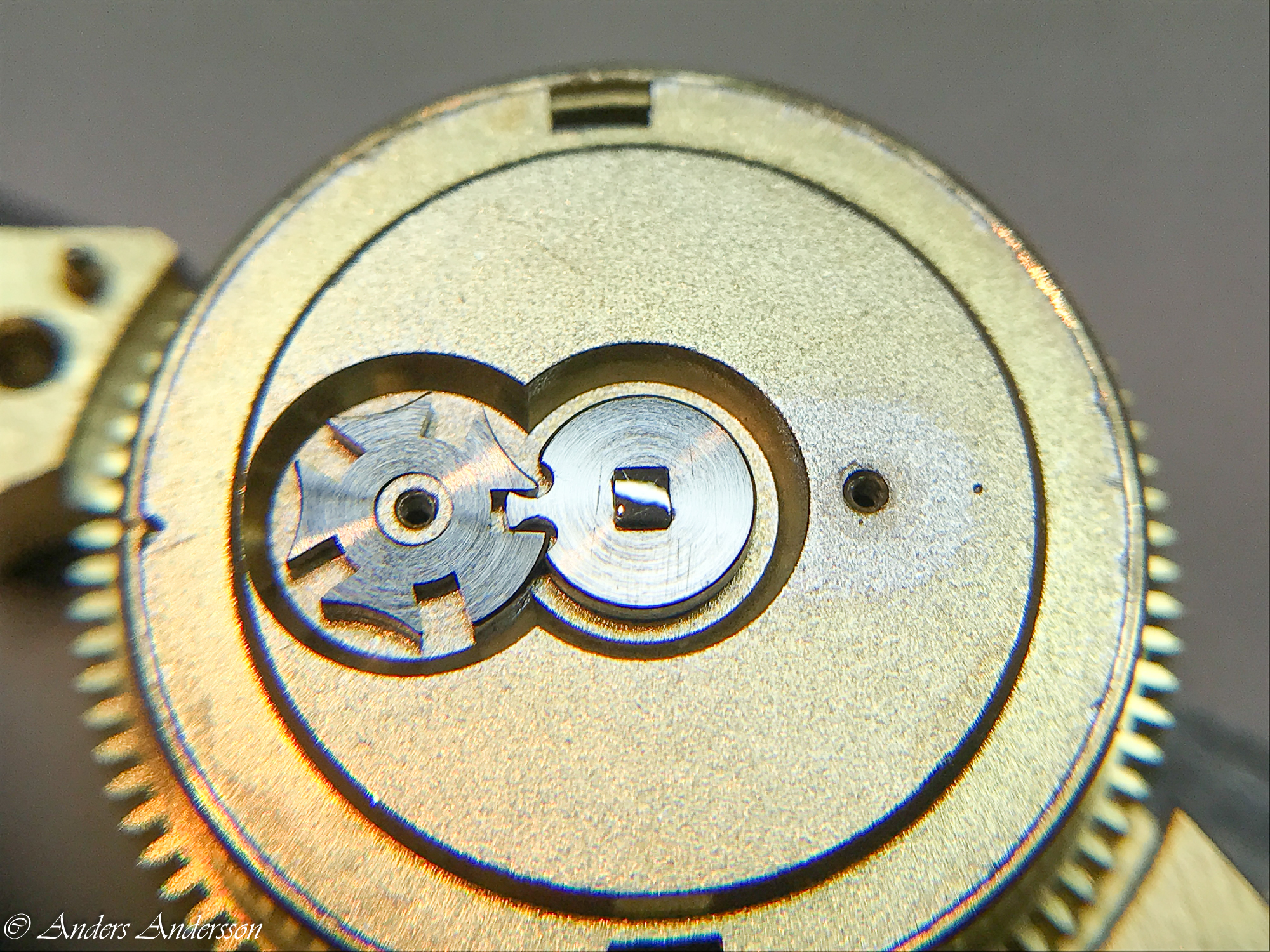Centrumhjulet med visarfriktionen, gånghjul och hake.
