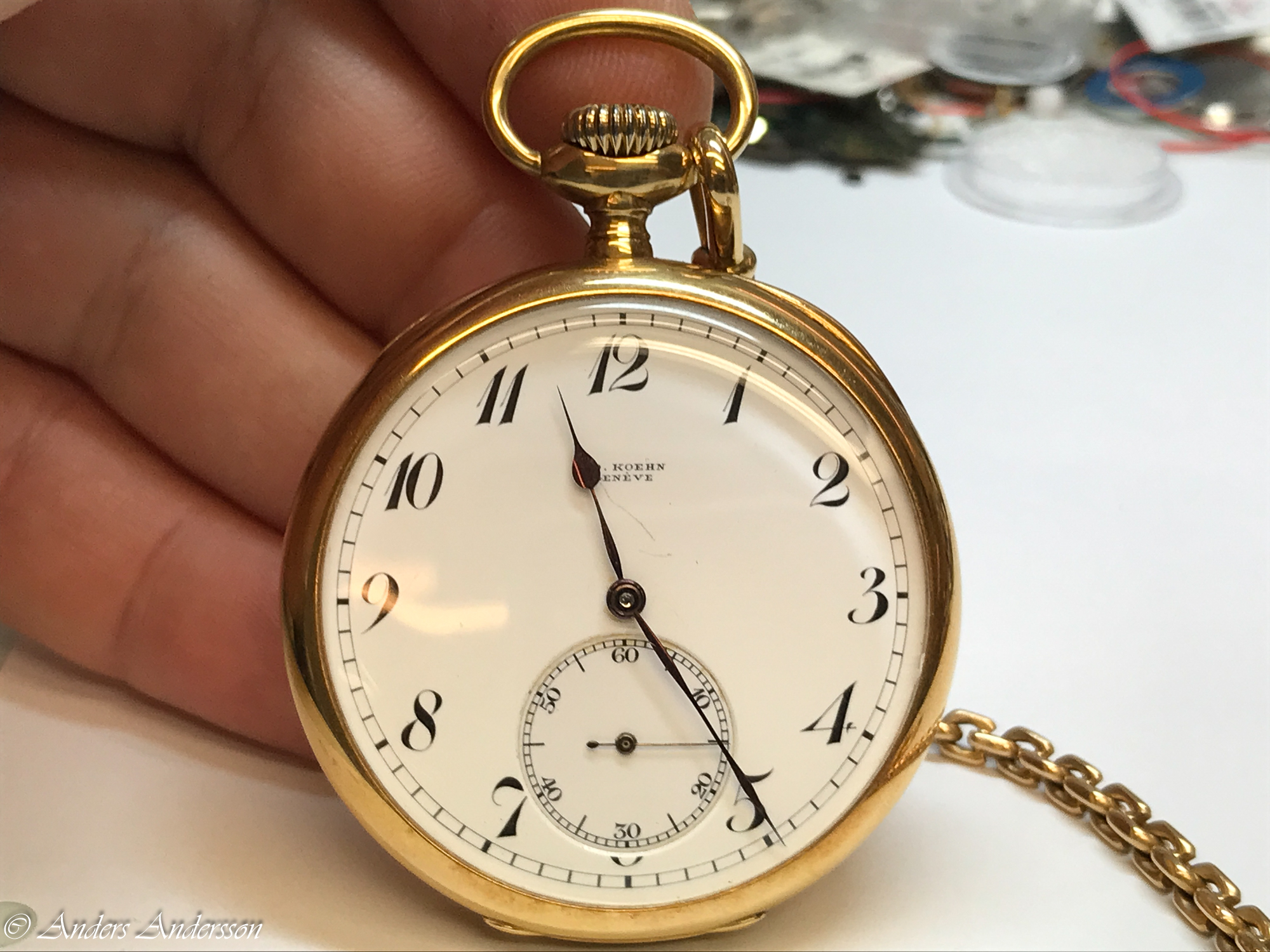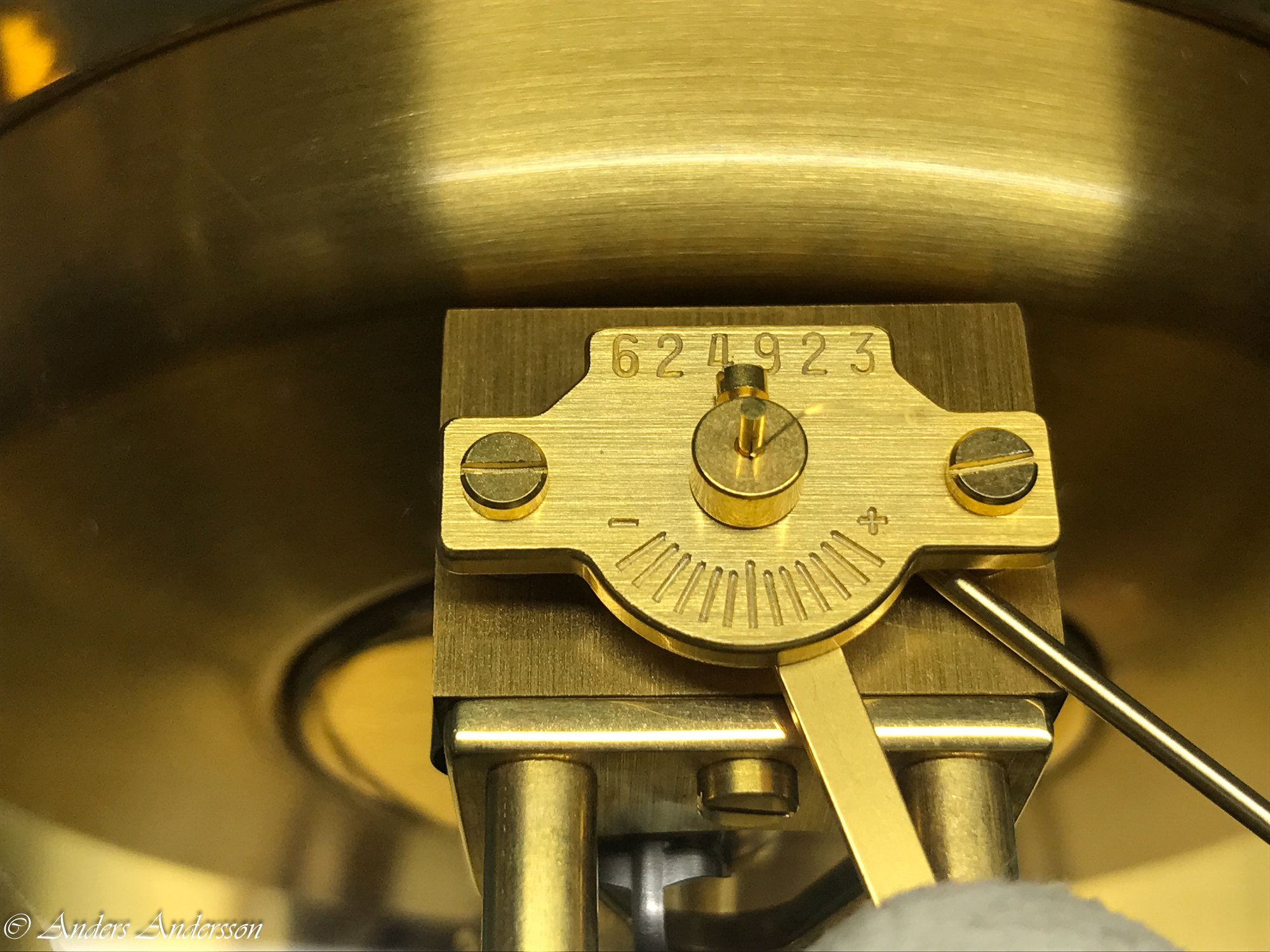 Balanskloven var nedåtböjd och förgyllningen var delvis bortslipad på ovansidan. När jag tog bort kloven syntes att någon filat ned framkanten så att kloven ytterligare skulle luta. Verket har kronometergång, kompensationsbalans med cylindrisk spiral. Balansaxeln såg ”hemmagjord” ut och var definitivt utbytt någon gång.