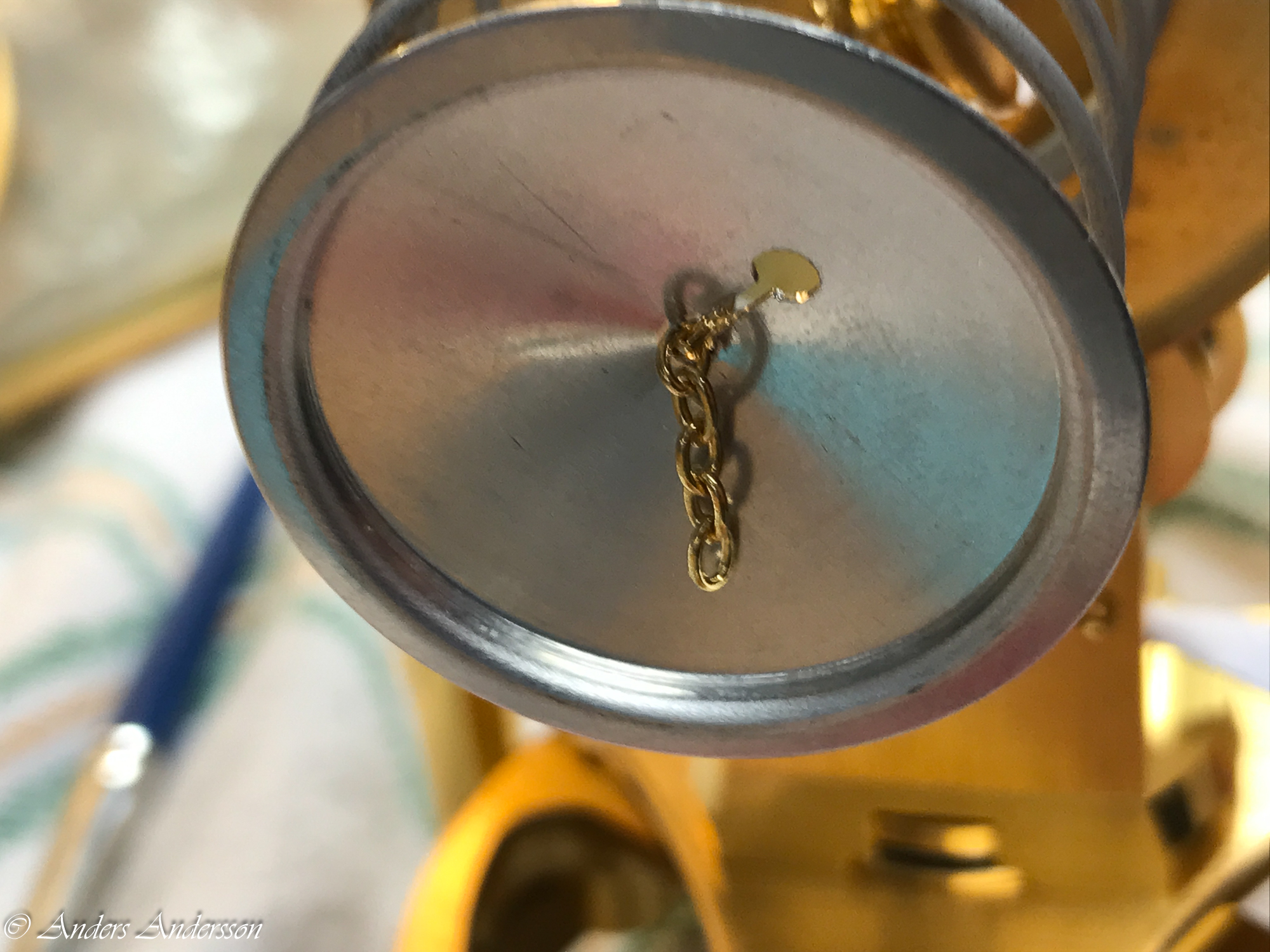 Jag tar bort behållaren med bälgen. Blev överraskad när fjädern och aluminiumskålen föll ut. Dessa delar ska sitta ihop i änden av kedjan. Varför var de lösa?