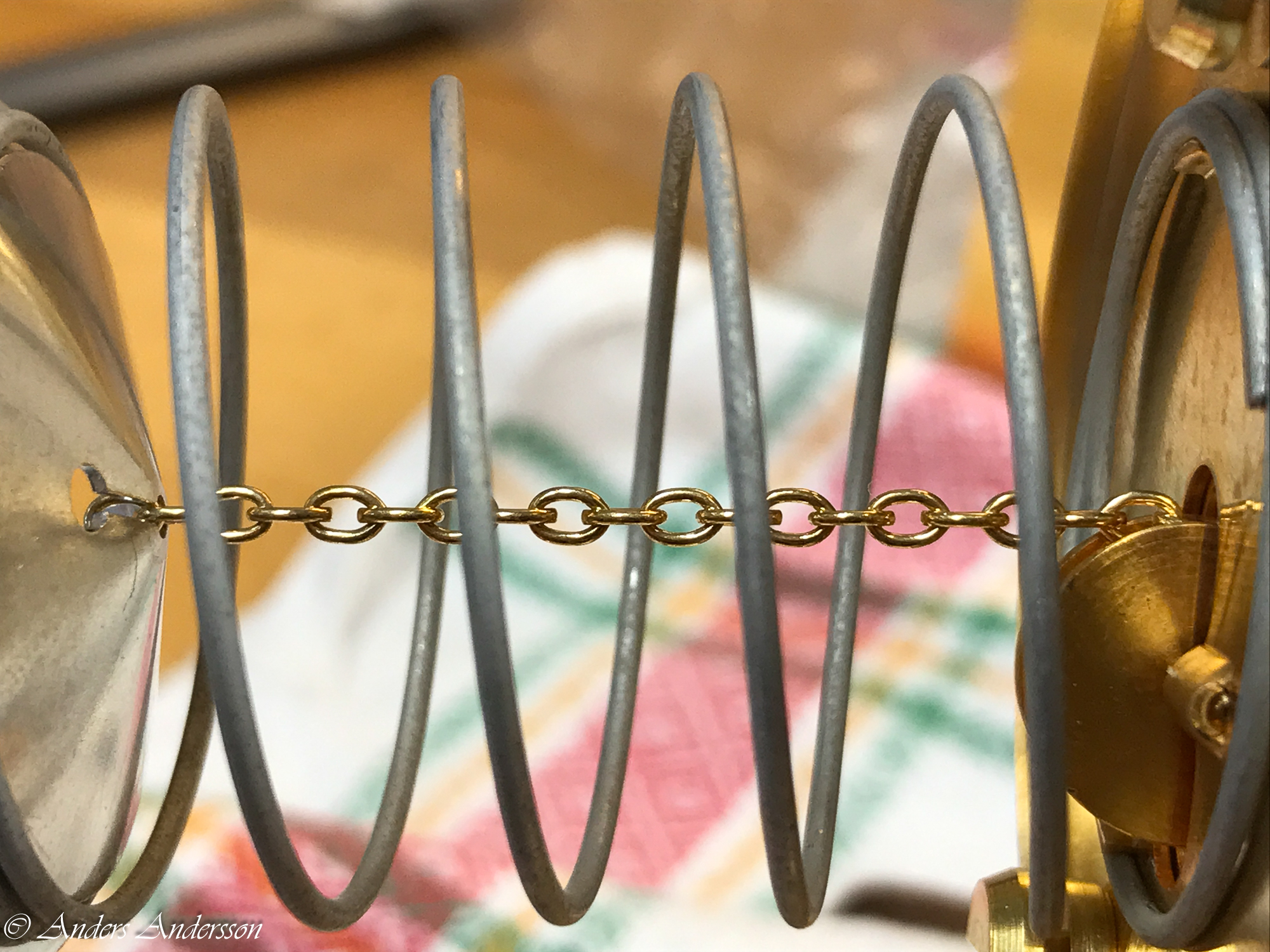Aluminiumskålen ska hamna på 45 mm avstånd från stativet – 6 länkar hänger fritt från kedjan.