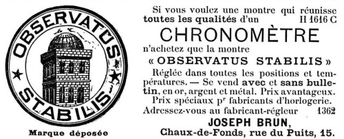 Efter mer eller mindre lyckade samarbeten med två andra urmakare under sent 1800-tal, först Antoine Inauen och senare Numa Perrenoud, så blev Joseph Brun år 1900 ensam chef för den urverksamhet och fabrik på adressen Rue de Puits 15 som han själv varit med och grundat. Joseph Brun var förmodligen en så kallad etablisseur, alltså någon som färdigställde och sålde klockor baserade på inköpta råverk och urkomponenter. Året därefter började Joseph att marknadsföra varumärket ”Observatus Stabilis” och erbjöd då precisionsur som justerats i alla lägen och temperaturer, med eller utan gångcertifikat, till förmånliga priser. Företagets ur såldes bland annat i USA, där han drev ett säljföretag, Staehli & Brun, tillsammans med en amerikan, Edward ”Ed” Staehli.