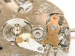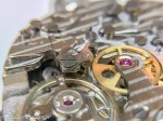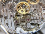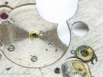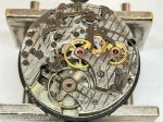 Men de tillverkade också armbandsur. Fick in ett av dessa för reparation. Klockan fungerade inte, vad var fel? Först och främst var fjädern av, relativt enkelt att avhjälpa. Knapparna för tidtagningen fungerade men någonting var inte som det skulle. Blockeringsarmen för kronografsekundhjulet låg hela tiden an mot sekundhjulet. Det visade sig att blockeringsarmen är lagrad ovanpå spärrhjulet. Ni som följer min blogg vet att bland de vanligaste felen/slitagen är att det blir slitet i lagret för fjäderhuskärnan i fjäderhusbryggan. Så också på detta ur – ett rejält slitage i fjäderhusbryggan. Så – när fjädern är spänd och klockan är uppdragen lutar fjäderhuskärnan och därmed blockeringsarmen så mycket att den aldrig kan släppa anliggningen mot sekundräknarhjulet. Men genom att justera slitaget i fjäderhusbryggan samt polera den slitna fjäderhuskärnan gick det fint att få blockeringen att fungera som den skulle igen.