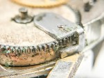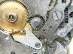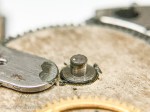 När detta var ordnat skulle sekundräknarhjulet ses över. Hjulet har ca 200 mycket små och fina tänder. Tändernas form är speciella jämfört med ”vanliga” hjultänder, tänderna har en spetsig V-form. Det gör att tanden blir känslig för tryck och stötar. På denna reparation hade tänderna blivit skadade, det måste åtgärdas på något sätt. Jag har en fint polerad stickel med hög vinkel, den är väldigt spetsig. Med hjälp av denna stickel skar jag bort alla skador på tänderna, sedan tog jag en avbruten oljegivare som jag slipat en vass spets på och ”drar” igenom varje tand för att ta bort eventuella grader.