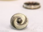 Man ser ibland hjul där urmakaren löst problemet med av en avbruten eller skadad tapp på samma sätt som var fallet med denna Lavina. Istället för att borra in en tapp har man svarvat en kort stump som ny tapp. Om jag råkar ut för att det inte finns ett nytt hjul att bara byta, brukar jag borra in en ny tapp. Med dagens fina borr i hårdmetall finns egentligen inget problem med att borra in en ny tapp.