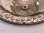 Det trasiga stenhålet var enkelt att byta. Den deformerade balanstappen var dessutom lite böjd. Jag skar bort den ”värsta” biten med en safirfil, sedan formade jag om tappänden – allt i rullbänken. Någon hade tryckt upp grader på undersidan av balanskloven, när jag tog bort dessa blev luften bra trots att axeln blivit något kortare.