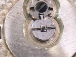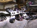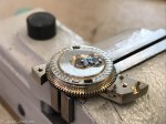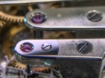 Efter rengöring, epilamisering och ihopsättning var det dags att kontrollera hur klockan gick. Försökte rucka klockan men när jag ruckat till maximal saktning gick klockan bra. Det ser ju konstigt ut att ruckarmen står helt snett ut från kloven (se näst sista bilden), men denna balans har ju två justerskruvar för ruckning så det ska gå fint att justera dem något. För att sakta ner balansen behövde jag skruva ut skruvarna något. Testade att vrida ett varv på först den ena skruven sedan den andra.