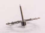 Ett borr 0,15 mm visade sig göra jobbet. Borrade först ett hål i den gängade biten som satt kvar i balansen – det gick bra – hålet hamnade bra i mitten. Satte skruvskallen i svarven och borrade hålet. Fortsatte i svarven med att göra ett passande stift. Sedan var det ”bara” att trycka ihop alla delar med lite Loctite. Det lyckades!
