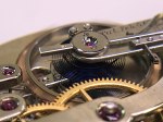 I denna typ av fina ur är hakstenarna inslipade av en gångriktare. När jag satte tillbaka stenarna räckte det med att trycka in dem i botten och sedan fixera dem – gången är redan inställd. Detta i motsats till moderna ur där urmakaren måste flytta hakstenarna för att ställa in gången rätt. Nästa moment blir att justera in anslagen. Här fick jag fila av sidorna på min tillverkade del tills gången gick igenom – enkelt uttryckt tills gånghjul och hake tickade fram. Denna klocka har inga anslagsstift utan anslagen är en del av verkbottnen. När jag justerat anslaget så att gånghjulstanden faller in på vila 1, sedan kontrollerat så att det fanns även dragning till vila 2 – då var det dags att börja forma hornen på haken. Då filade jag hornets yta tills liverstenen kunde passera fritt med luft och säkerhet. När jag i detta skede drog upp verket för att ge kraft fram till gånghjulet och satte fart på balansen gav haken tillräcklig kraft för att balansen skulle röra på sig utan spiral. Nu justerade jag längden på säkerhetskniven. Då vrider man balansen så att liverstenen går fritt ifrån haken. Då ska kniven ta i den lilla rullen på liverrullen, det skall vara lagom luft mellan lilla rullen/kniven/anslaget. Du kan se bilder och hur jag ställer in gången i ett annat inlägg genom att klicka här.