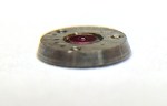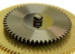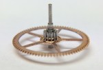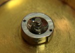 Jag börjar med buren eller den roterbara balansbryggan som Brun själv benämner den. Den hjulformade bryggan passar perfekt i en ursvarvning i verkbottnen, för att hålla fast bryggan är två skruvar placerade motstående. I ett D-format hål passar spiralens ytterfäste in. Om man lossar något på skruvarna kan bryggan roteras så att haltningen kan ställas in. Haltning mäts i millisekund (ms), en perfekt inställd haltning är 0 ms och man försöker få den i alla fall mindre än 1 ms. En modern testmaskin visar haltningen