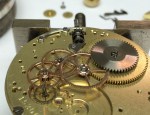 Fick ett fickur för reparation märkt D S C – Ducommun-Sandoz & Cie, La Chaux de Fonds, Schweiz. Ett ganska fint verk av god kvalité. Fjäderhuset var utrustat med stoppverk. I detta fall fanns alla delar kvar, tyvärr saknas delar ibland i dessa stoppverk. Man satte stoppverk för att fördela fjäderns kraft mer jämnt. Om fjäderhuset roterar sju varv utan stoppverk är det första varvet förhållandevis svagt och det sista varvet starkt. Så om stoppverket roterar fem varv tas den svagaste respektive starkaste biten av fjädern bort.