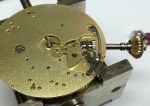När jag öppnat båda boettlocken överraskades jag av ett vackert dekorerat urverk försett med en märklig konstruktion där en balansklove normalt brukar sitta.  Min första tanke var – en tourbillon – men jag upptäckte snart att den hjulliknande konstruktionen var fastskruvad i verkbottnen.  Jag tänkte förklara lite mer ingående några av de mer ovanliga finesser detta urverk har i del 2.