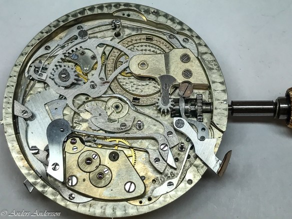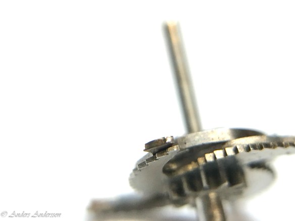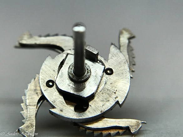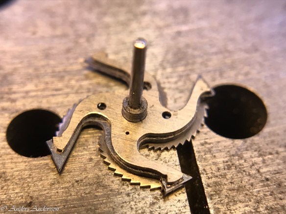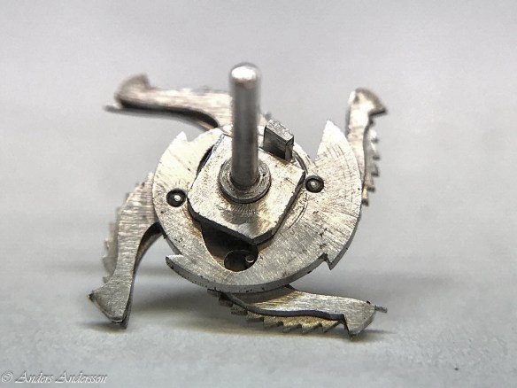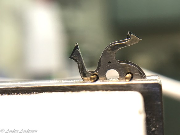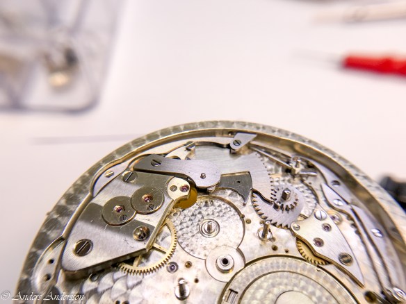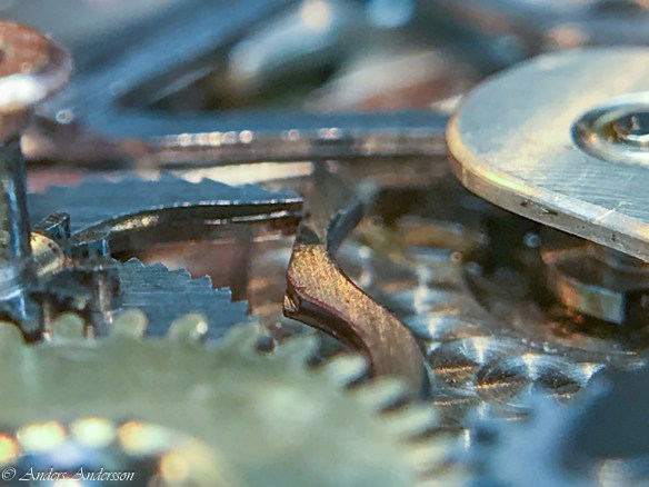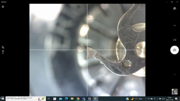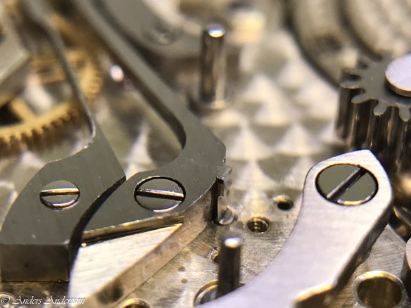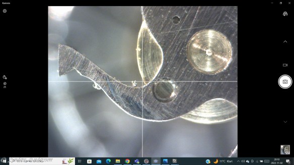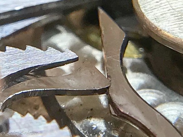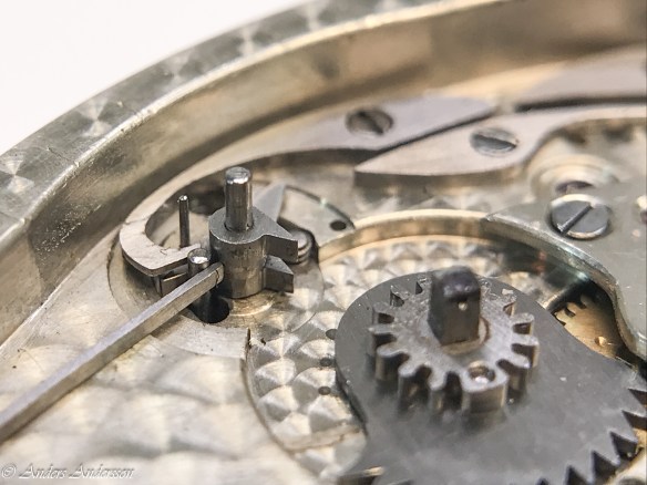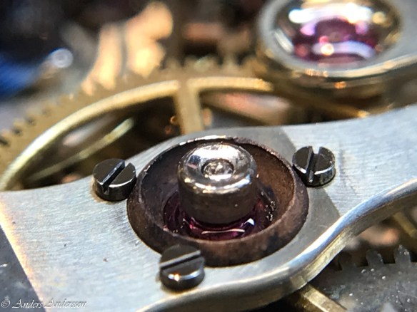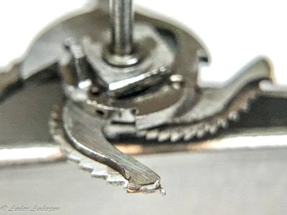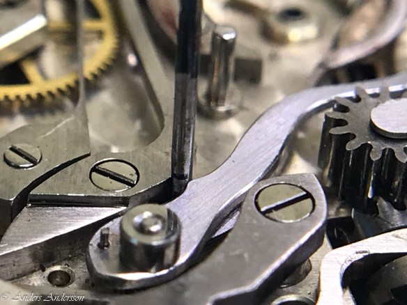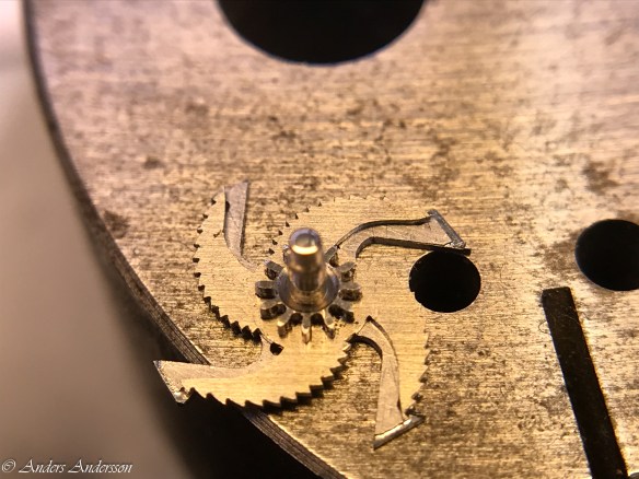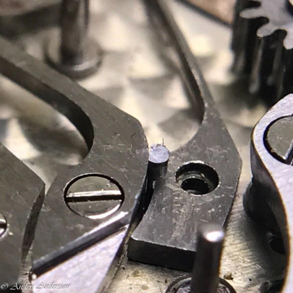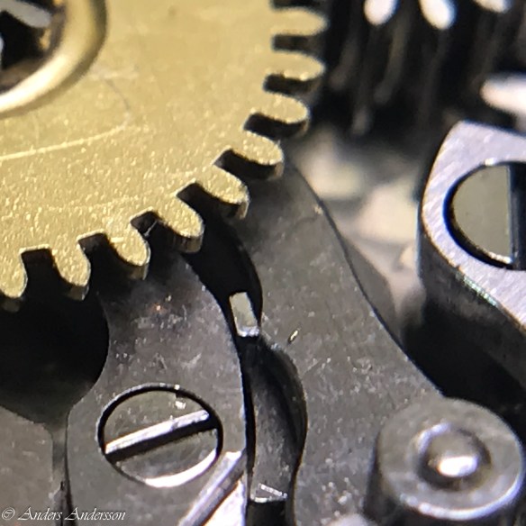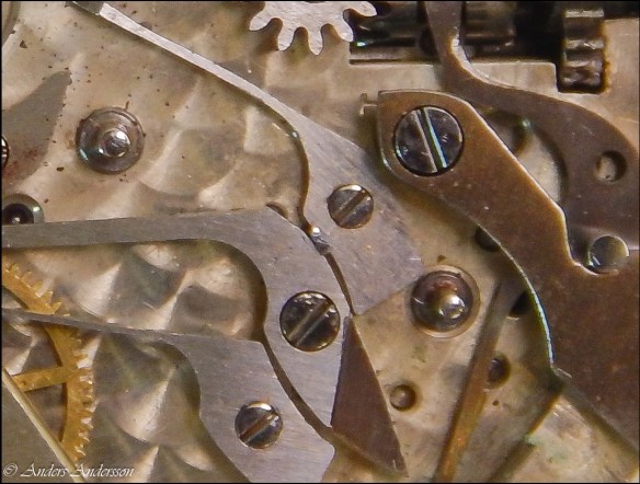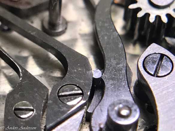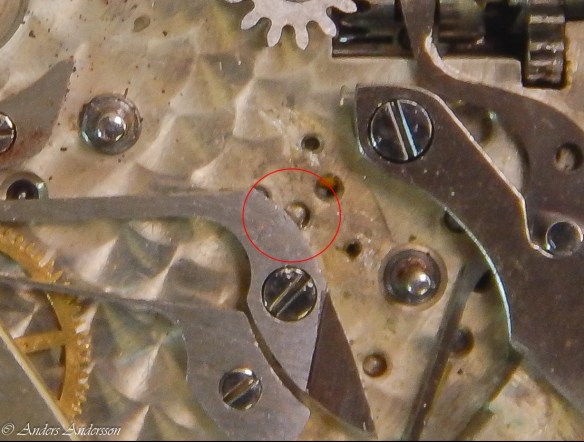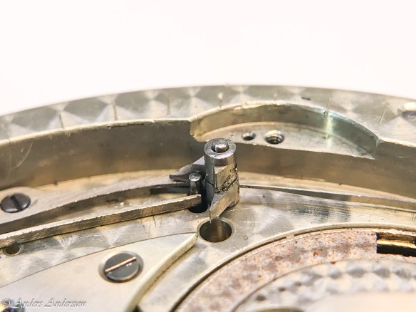 Ganska snart upptäckte jag att verket blivit utsatt för misshandel av en ”så kallad urmakare”. Jag upptäckte många fel och slitage, men även tidigare reparationer av någon med kunskap. På ovanstående bild ser man att hakstenen är flyttad uppåt parallellt med haken.