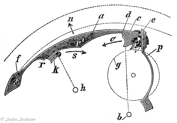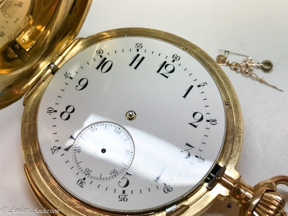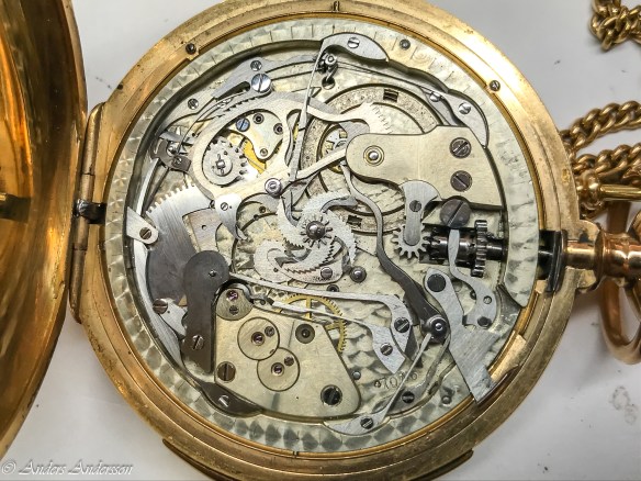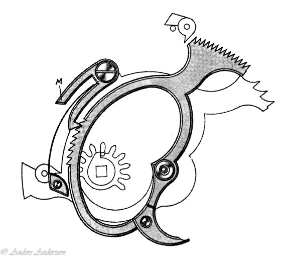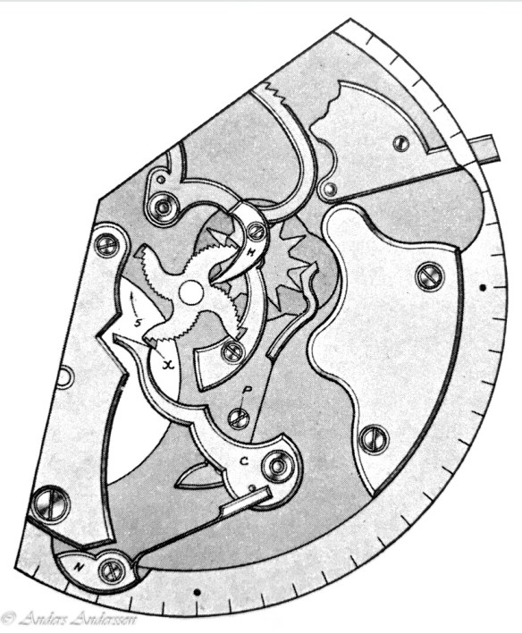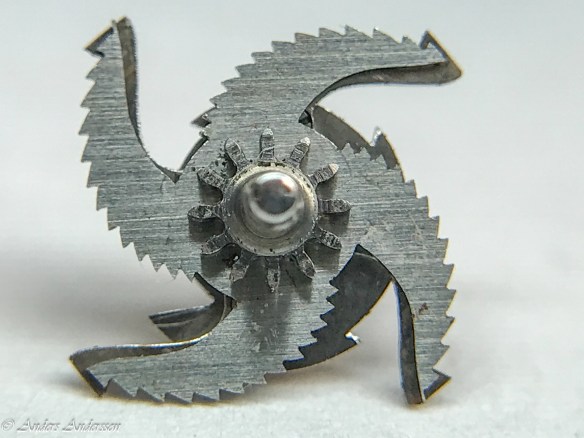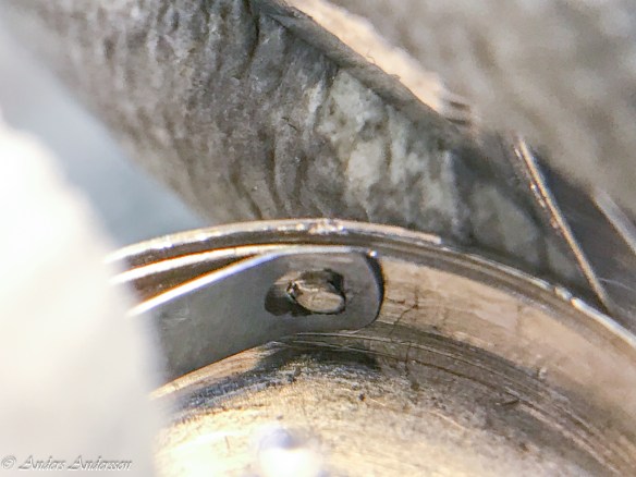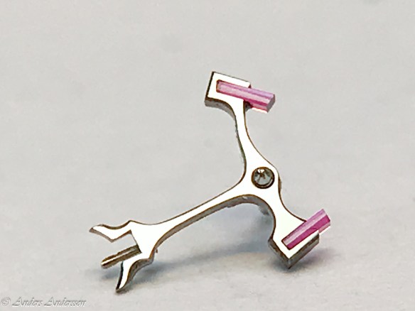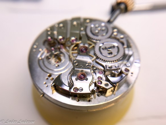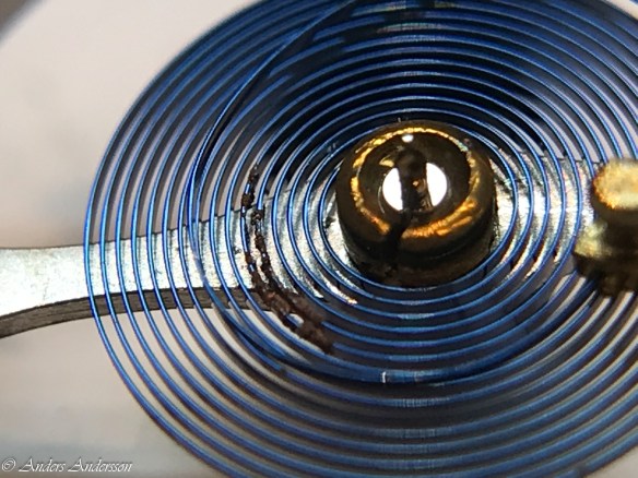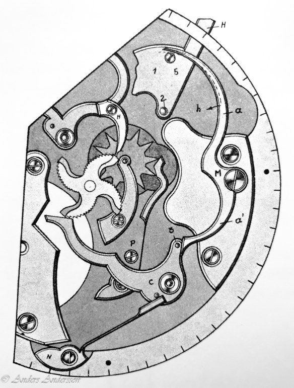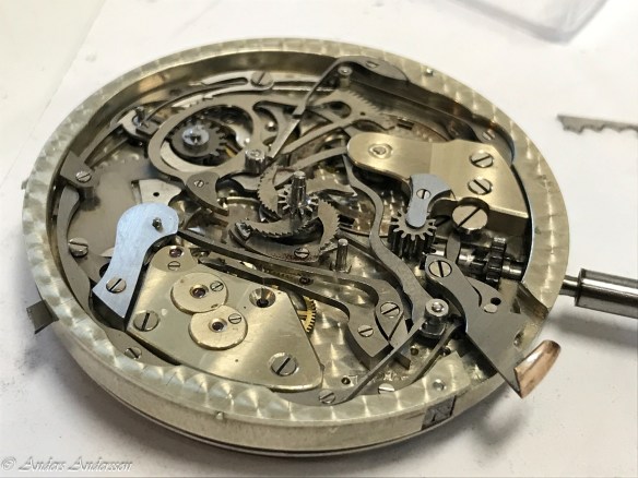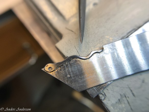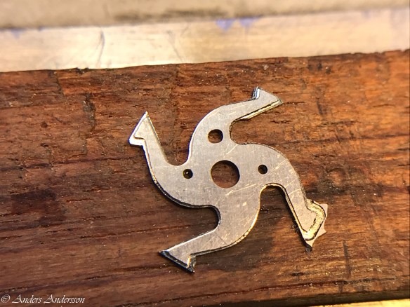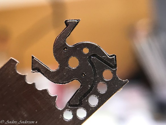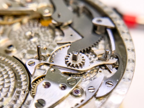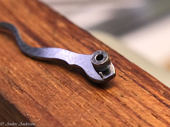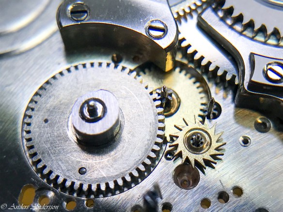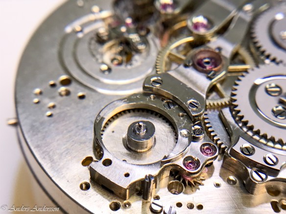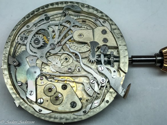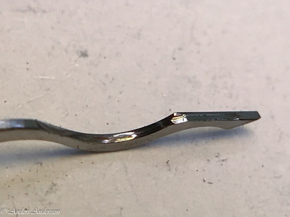 Ganska snart upptäckte jag att verket blivit utsatt för misshandel av en ”så kallad urmakare”. Jag upptäckte många fel och slitage, men även tidigare reparationer av någon med kunskap. På ovanstående bild ser man att hakstenen är flyttad uppåt parallellt med haken.