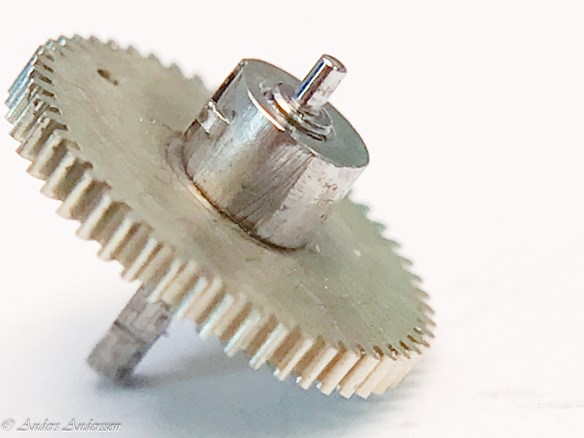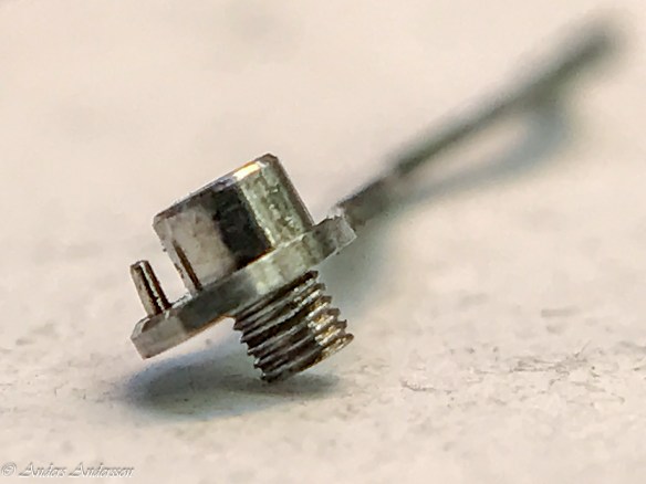 Uppenbarligen har reparatören inte förstått att axeln för visarväxelhjulet INTE är gängad utan inpressad. Inget är dock så skadat att det stoppar funktionen.