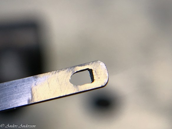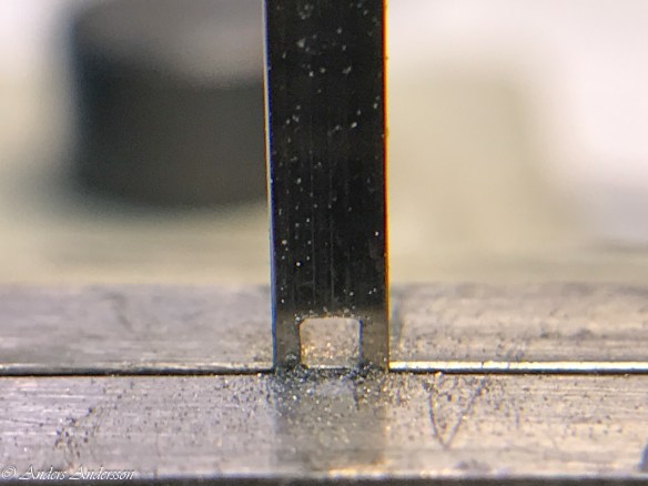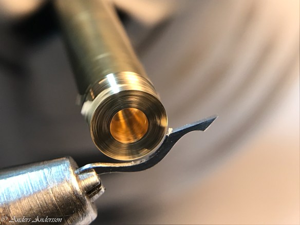 Jo änden på fjäderhuskärnan var slarvigt avstucken från fabriken så en liten tapp stack ut ca 0,5 mm på undersidan. Man kan ana den efter att jag slipat och polerat änden. Med denna korrigeringen går det lätt och fint att sätta in och ta ut fjäderhuset, kärnan har marginal mot botten och poleringen gör att inga ytterligare märken skapas.