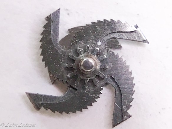 Slagverkets delar. Stora hack i verkbottnen samt hjulet under utlösaren för slaget.