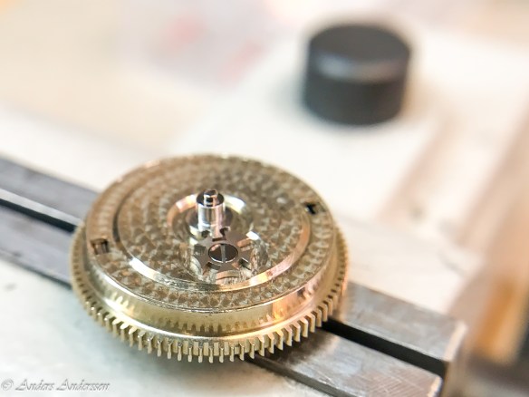 Sätter in nya stenar. Testar med detta först. Hade jag haft ett nytt gånghjul hade jag naturligtvis bytt det, men jag letade hos leverantörer och på nätet men hittade inget. Om inte tandtopparna redan varit ”grejade” med hade jag kunnat polerat topparna. Då sätter man upp hjulet i svarven och sätter en fin polerskiva mot topparna. Med hjälp av delningsskivan flyttar man fram tand för tand och polerar topparna en efter en. Det skulle varit ett sista alternativ om inte klockan skulle gå bra och balansen svänga med bra amplitud. Men det visade sig senare att den ändå fungerade ok så jag lämnade hjulet så här.